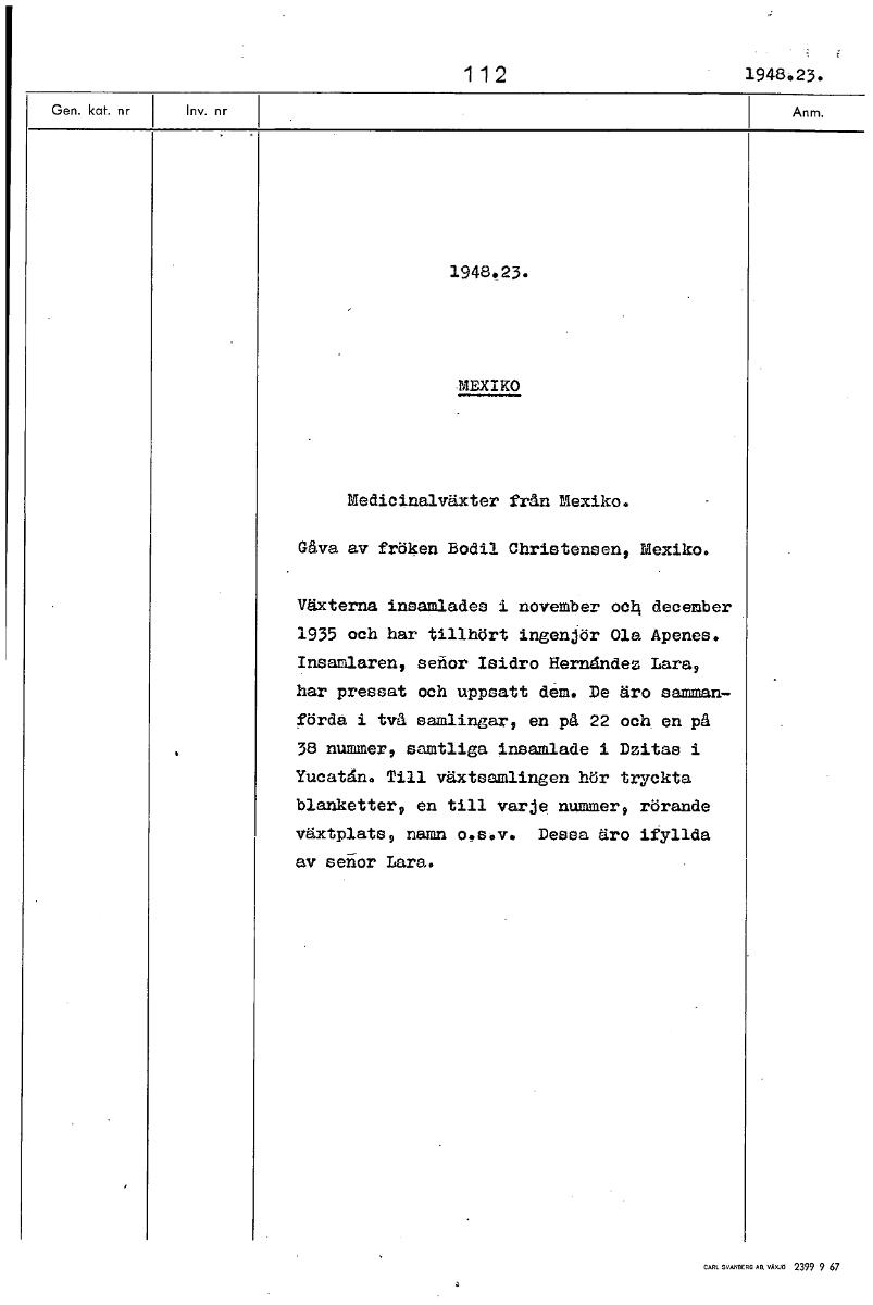 1 1 2 1948023. 1948.23. MEXIKO Medicinalväxter från Mexiko. Gåva av fröken Bodil Christensen, Mexiko. Växterna insamlades i november och december 1935 och har tillhört ingenjör Ola Apenes. Insamlaren, senor Isidro Herndndez Lara, har pressat och uppsatt dSm. De äro samman- förda i två samlingar, en på 22 och en på 38 nummer, samtliga insamlade i Dzitas i Yucatdn. Till växtsamlingen hör tryckta blanketter, en till varje nummer, rörande växtplats, namn o.s.v. Dessa äro ifyllda av senor Lara. [ocr]