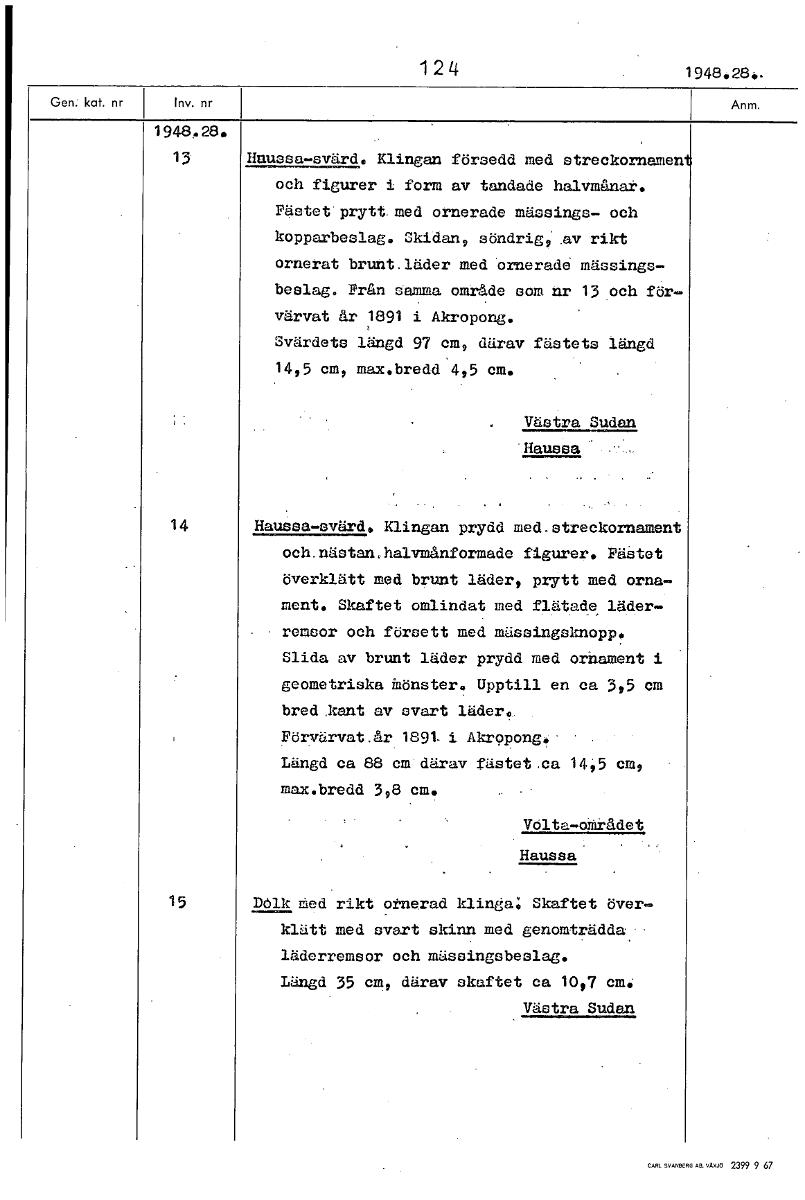 124 1948.28.. 1948.28. 13 Haussa-svärd. Klingan försedd med streckornamen och figurer i form av tandade halvmånar. Fästet prytt med ornerade mässings- och kopparbeslag. Skidan, söndrig, av rikt ornera...