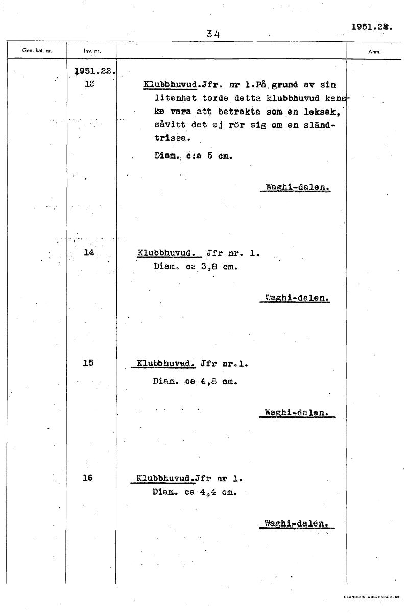 • 1951.2R. 34 1951.22. 13 Klubbhuvud.Jfr. nr 1.14 grund av sin litenhet torde detta klubbhuvud kens ke vara att betrakta som en leksak, såvitt det ej rör sig om en sländ- trissa. Diam. 5 cm. Waghi-dalen... Visa hela