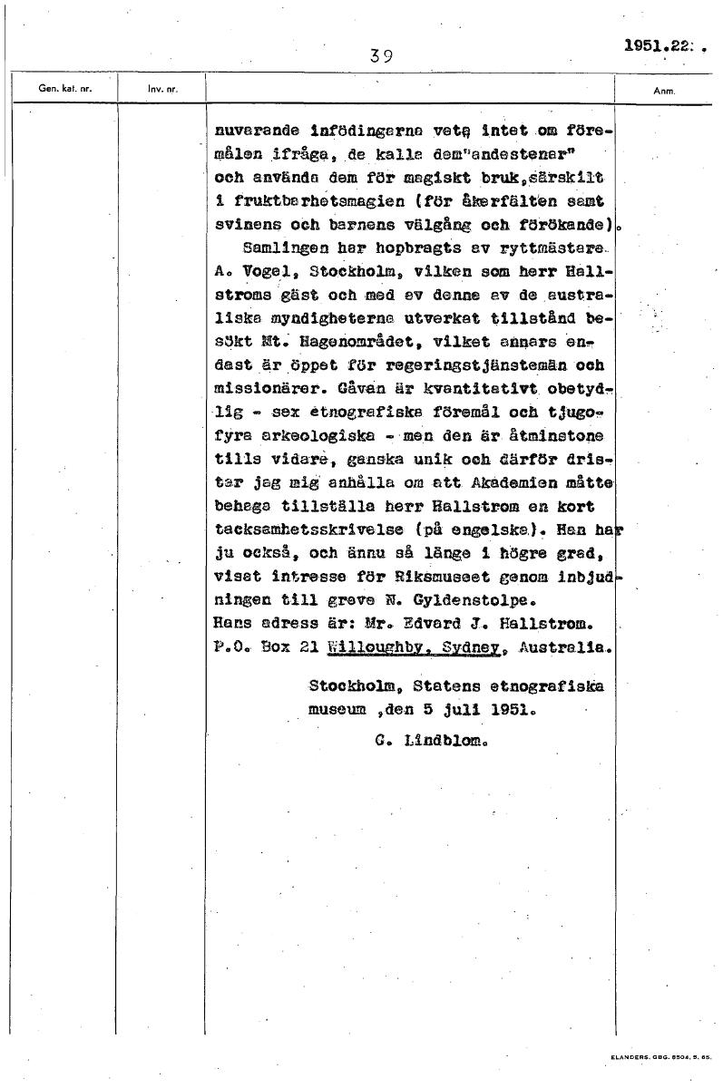1951.22: 39 nuvarande infödingarna veto intet om före- målen ifråga, de kalle dem"andestenar" och använda dem för magiskt brubsärskiIt i fruktbarhetsmagien (för åkerfälten samt svinens och barnens välgång och förökande). Samlingen her hopbragts ev ryttmästare. A. Vogel, Stockholm, vilken som herr Hall- etrems gäst och med ev denne av de austra- liska myndigheterna utverkat tillstånd be- sökt Mt. Hagonområdet, vilket annars en- dast är öppet •för regeringstjänstemän och missionärer. Gåvan är kvantitativt. obetyd- lig - sex etnografiska föremål och tjugo- fyra arkeologiska - men den är åtminstone tills vidare, ganska unik och därför dris- tar jag mig anhålla om ett Akademien måtte behaga tillställa herr Hallstrom en kort tacksamhetsskrivelse (på engelska). Han ha ju också, och ännu så länge i högre grad, visat intresse för Riksmuseet genom inbjud ningen till greve N. Gyldenstolpe. Rens adress är: Mr. Edvard J. Hallstrom. P.O. Box 21 Willoughbv, Sydney, Australia. Stockholm, Statens etnografiska museum ,den 5 juli 1951. G. Lindblom. [ocr]