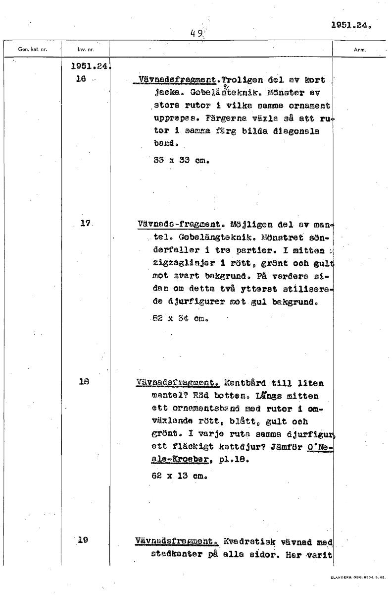 1951.24. 4 9, 1951.24 16 VäynadsfreAment.Trolig4n del av kort jacka. Gobelanteknik. Mönster ev stora rutor i vilka samme ornament upprepas. Färgerna växla så att ru tor i samma färg bilda diagonala band. 33 x 33 cm. 17 Vävnads-fragment. Möjligen del av gen tel. Gobelängteknik, Mönstret sön- derfaller i tre partir. 1 mitten zigzsglinjar i rötte grönt och gul mot svart bakgrund. På vardera si- dan om detta två ytterst stilisera de djurfigurer mot gul bakgrund. 82 x 34 cm. 18 Vävnadsframin4 Kantbård till liten mantel? Röd botten. ange mitten ett ornamentsband med rutor 1 om- växlande rötte bläng gult och grönt. / varje ruta samma djurfigu ett fläckigt kattdjur? Jämför O.NO- ale-Kroebere p1018. 82 x 13 cm. 19 Vävnadsfragmeht. Kvadratisk vävnad med. stadkanter på alle sidor. Her varit [ocr]Stäng