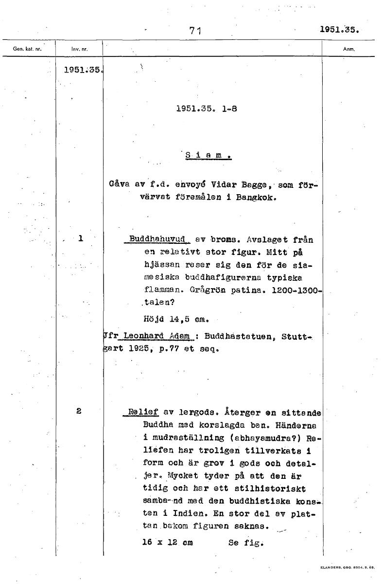 71 1951.35. 1951.35 1951.35. 1-8 S.1 a m Gåva avf.d. envoyd Vidar Bagge, som för- värvat föremålen i Bangkok. 1 Buddhahuvud av brons. Avslaget från • en relativt stor figur. Mitt på hjässan reser sig ...Visa hela