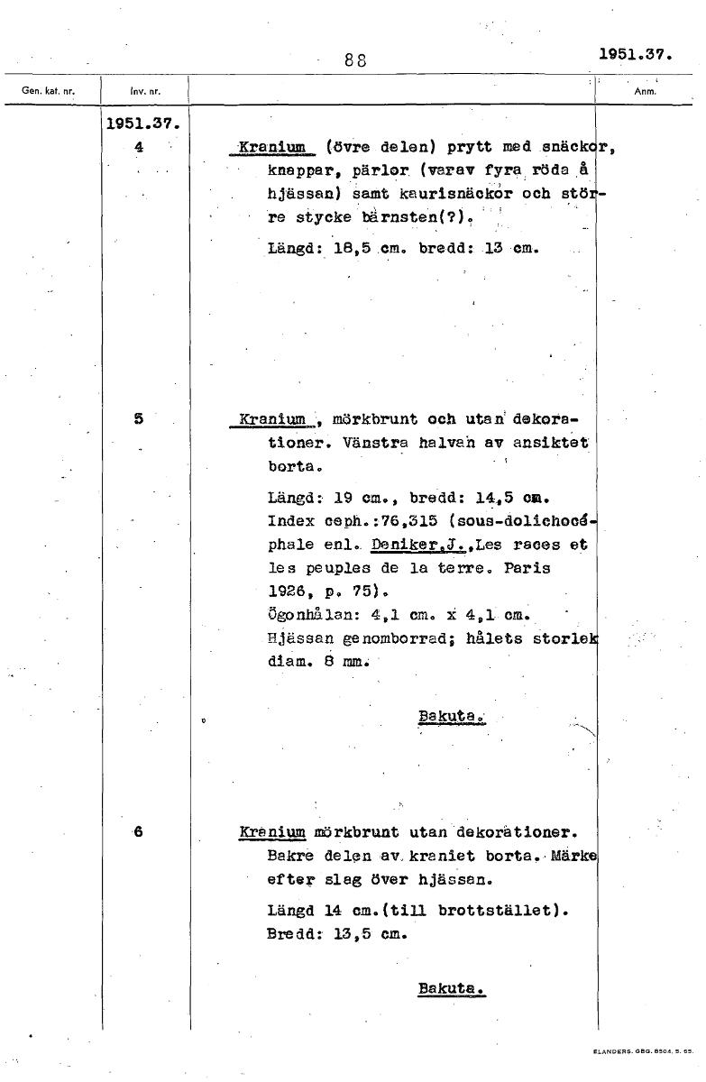 88 1951.37. 1951.37. 4 Kranium (övre delen) prytt med snäck r, knappar, pärlor. (varav fyra röda ,å hjässan) samt kaurisnäckår och stö- ra stycke barnsten(?). Längd: 18,5.cm. bredd:.13.cm. 5 Kranium ,...
