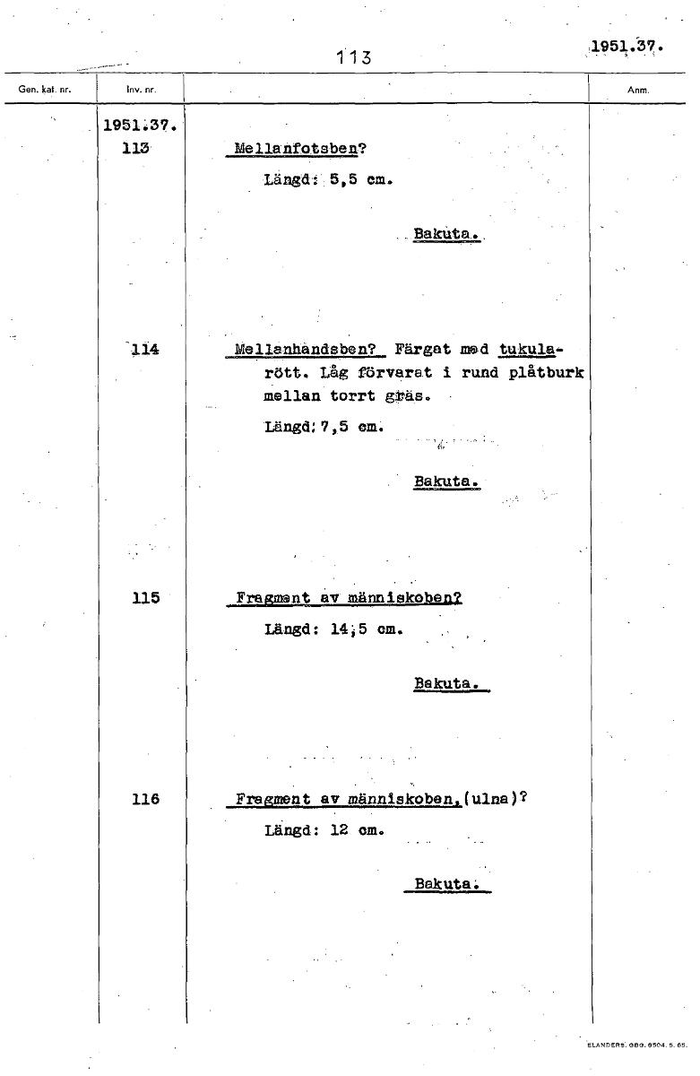 • .1951;37. 1 1 3 • .• 1951:37. 113 Mellanfotsben? Längd: 5,5 em. Bakuta., 114 Mellanhandsben? Färgat med tukula- rött. Låg förvarat i rund plåtburk mellan torrt gtas. Längd: 7,5 om. Bakuta. 115 Fragmen... Visa hela