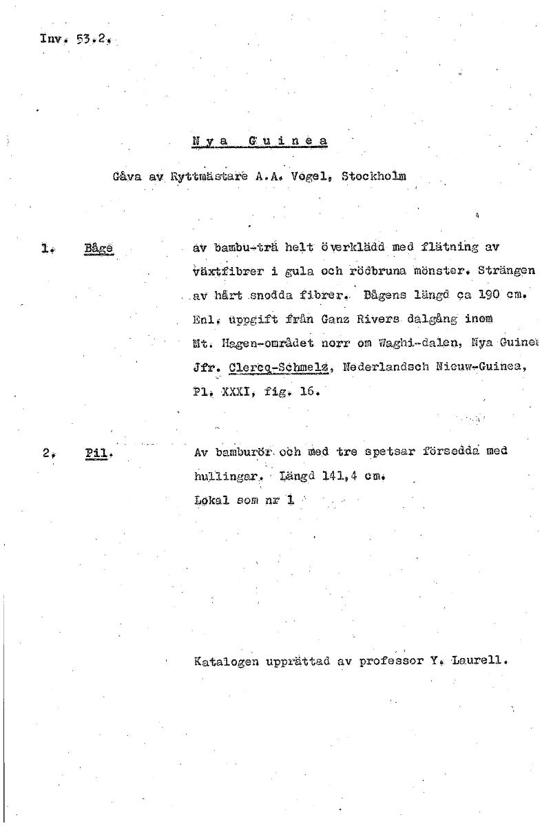 Inv. 53. Lz i n a Gåva av Ryttmästare A.A. Vogel, Stockholm av banbuträ helt öierklädd med flätnihg av Växtfibrer i gula och rödbruna mönster. Strängen av hårt .snodda fibrer.- Pågens längd ca 190 cm. Enl. uppgift från Ganz Rivers dalgång inoM Ut. Hagen-området norr om Waghi-dalen4 Nya Guinet Jfr. Clerbo-SöhmelZ, Nederlandsoh Nieuw,Guinea, Pl. XXXI, fig:„ 16. Pil. Av bamburör,oth med tre spetsar försedda: med hu1ingar.. iiängd 141,4 cm. Lokal som nr 1 Katalogen upprättad av professor Y,. 'Laurell. [ocr]