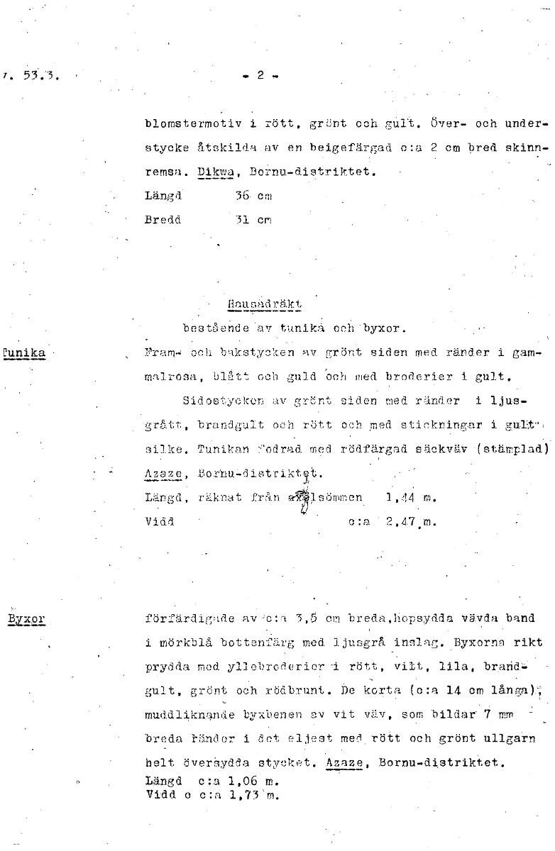 7. 53.5. 2 blomstermotiv i rött, grönt och gult. Över- och under- stycke åtskilda av en beigefärgad c:a 2 cm bred skinn- remsa. Dikwa, Bornu-distriktet. Längd 36 cm Bredd 31 cm Hausdräkt bestående 'av tunik. och byxor. Punika Pram., och b,tlkstycken ,;iv grönt siden med ränder i gam- malrosa, blått och guld 'och med broderier i gult. Sidostycken av grönt, siden med ränder i ljus. grått, brandgult och rött och med stickningar i guIt silke. Tunikan lodrad med rödfärgad säckväv -(stämplad) Azaze, Bornu;-distrikt.Nt. Längd, räknat från lsömmen 1,44 m. Vidd 2,47m. Byxor förfärditstele av )0:3, 3,5 cm bredn,hopsydda vävda band i mörkblå bottenfrg med. :ljusgrå inslag. Byxorna rikt prydda med yriebroerier i rött, vilut, lila, brand- gult, grönt och rödbrunt. De korta (c:a 14 cm långa), • muddliknande byxbenen sv vit väv, som bildar 7 mm breda tänder i det eljest me,rött och grönt ullgarn. helt överåydda stycket. Azaze, Bornu-distriktet. Längd c:a 1,06 m. Vidd o c:a 1,73'm. [ocr]
