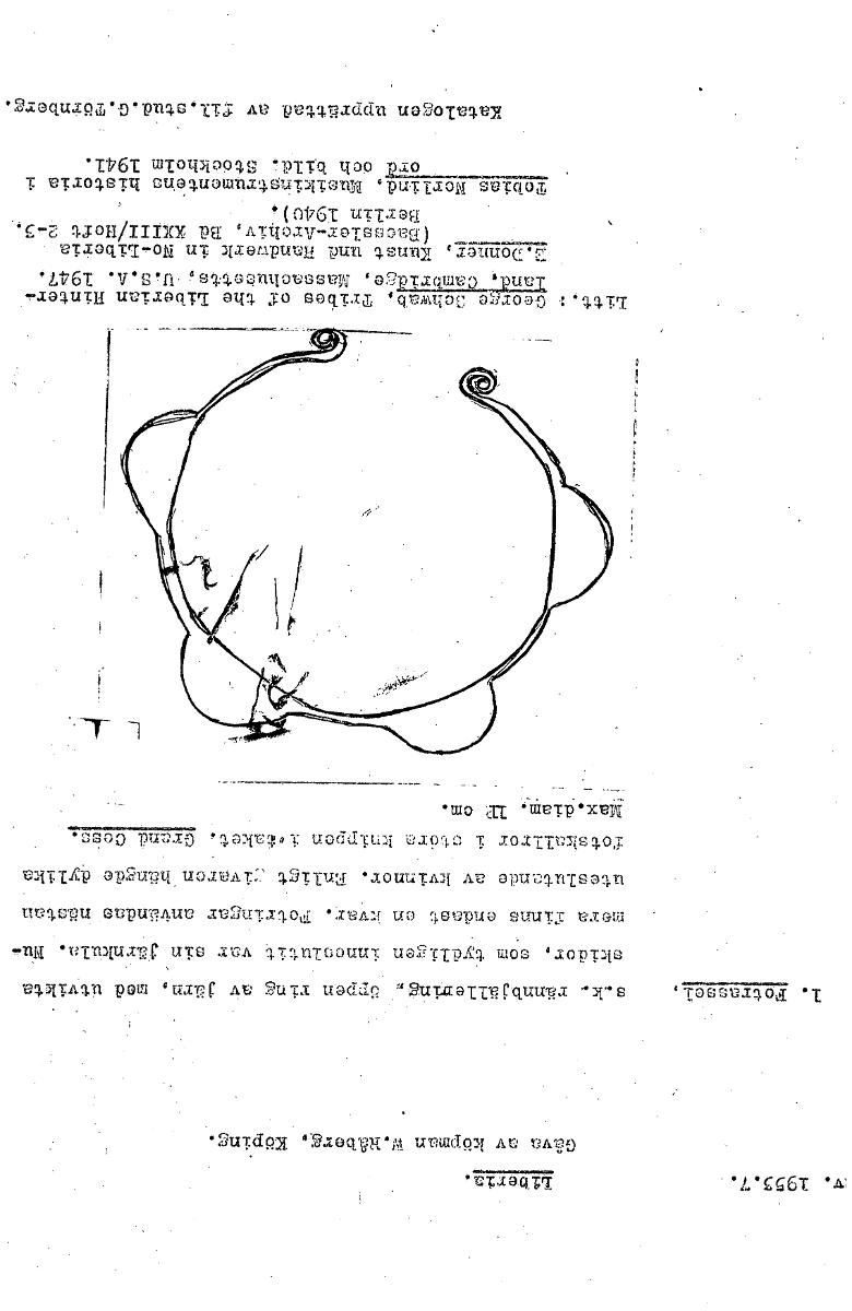 v. 1953.7.. Gåva av köpman W.Råberä, Köping. 1. Potrassel, s.k. rännbjällering„ öppen ring av järn, med utvikta skidor, som tydligen inneslutit var sin järnkula. Nu- mora finns endast on Fzvar. Potringar anVändas nästan uteslutande av kvinnor. Enligt ,:ivaren hängde dylika fotskallror i störa knippen iotaket. Grand Coås. Max.diam. IP cm. Litt.:. George3chwab Tribes of the Liberian Hinter ISHU77776767I3;je, Massachusetts, U.S.A. 1947. L.Donner, Kunst und Handverk in No-Liberia (Daessler-Archiv, Bd XXIII/Hoft 2-3, Berlin 1940). Tobias Norlind, Musikinstrumentens historia i och bild. Stockholm 1941. Katalogen upprättad av fil.stud.G.Törnberg. [ocr]
