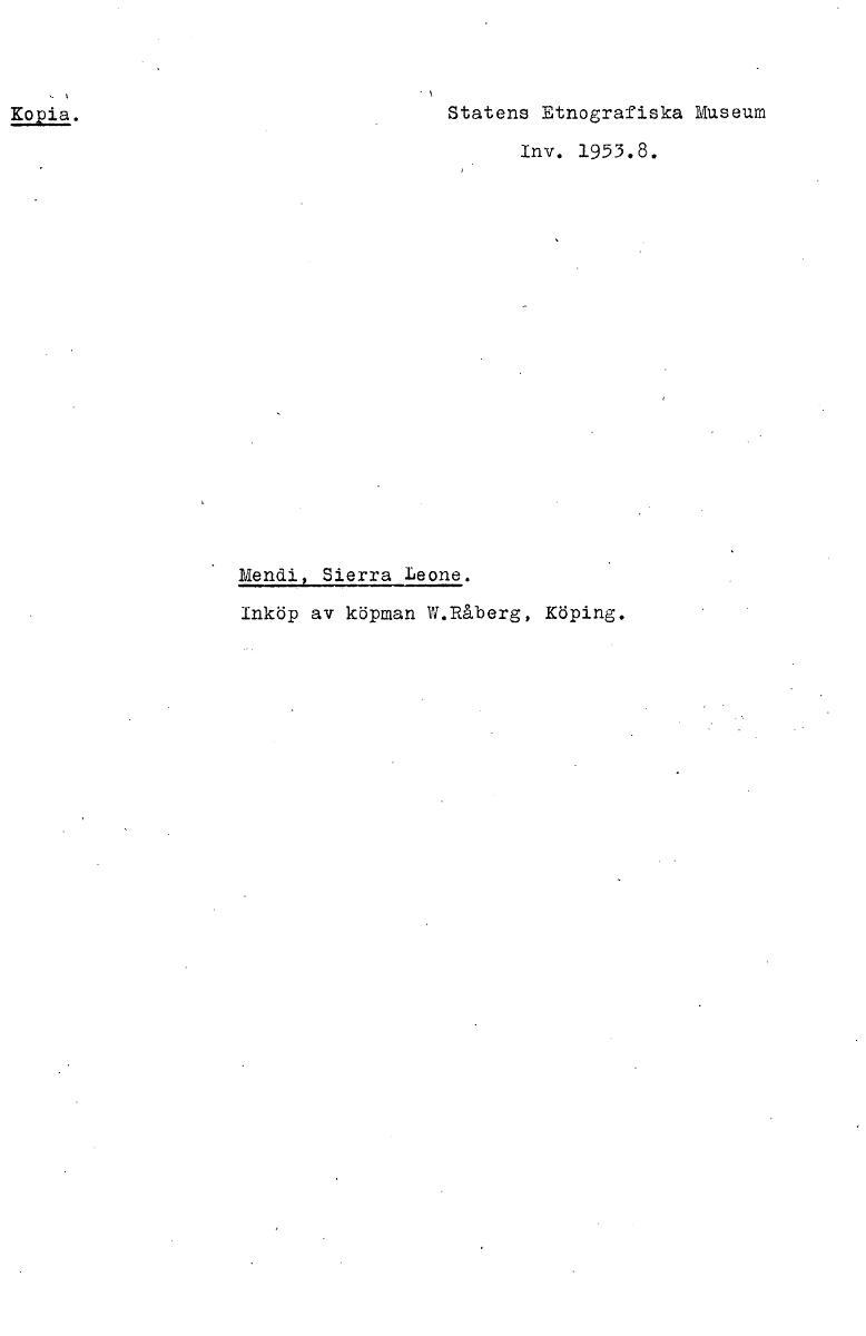 • Kopia. Statens Etnografiska Museum Inv. 1953.8. Mendi Sierra Leone. Inköp av köpman W.Råberg, Köping. [ocr]