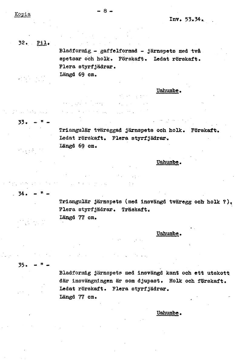 Kopia 53.34., 32. Pil. Bladformig.-.gafteltdrmad järnspets med tmBh spetsar och holk. ?örskaft. Ledat rörskaft. Flera styrfjädrar. Längd 69 cm. Uahumbe.. 33. Triangulär tväreggad järnspets och holk. Förskaft. Ledat rörskaft. Flera styrfjädrar. Längd 69 cm. Uahumbe. Triangulär järnspets (med insvängd tväregg och holk n. Flera styrfjädrar. Träskaft. Längd 77 cm. Uahumbe. 28. - Bladformig järnspets med insvängd kant och ett utskott där insvänggngen är som djupast. Holk och förskatt. Ledat rörskaft. Flera styrfjädrar. Längd 77 cm. Uahumbe. [ocr]Stäng