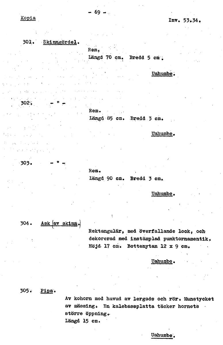 69 -» Kopia Inv. 53:34. 301. •Skinngördel. Rem. längd 70 cm. Bredd 5 må-. Uåhumbå': Rem. Längd 85 cm. •Bredd 3 om. Uahumbe. Rem. Längd 90 cm. Bredd 3 cm. Uahumbe: 304. Ask av skinn.) Rektangulär, med ...Visa hela