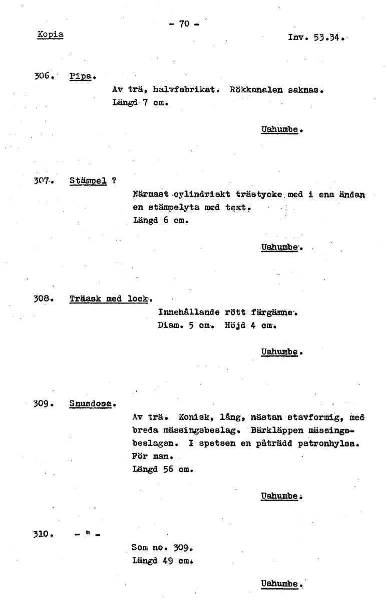 70 Kopia 306, Pipa. Av, trä, halvfabrikat. Rökkanalen saknas. Längd 7 om. Uahumbe. 307.. p"/ ? Rärmast.cylindriskt trästycke, med i ena ändan en stämpelyta med text. Längd 6 cm. Uahumbe. 308. Träask m...