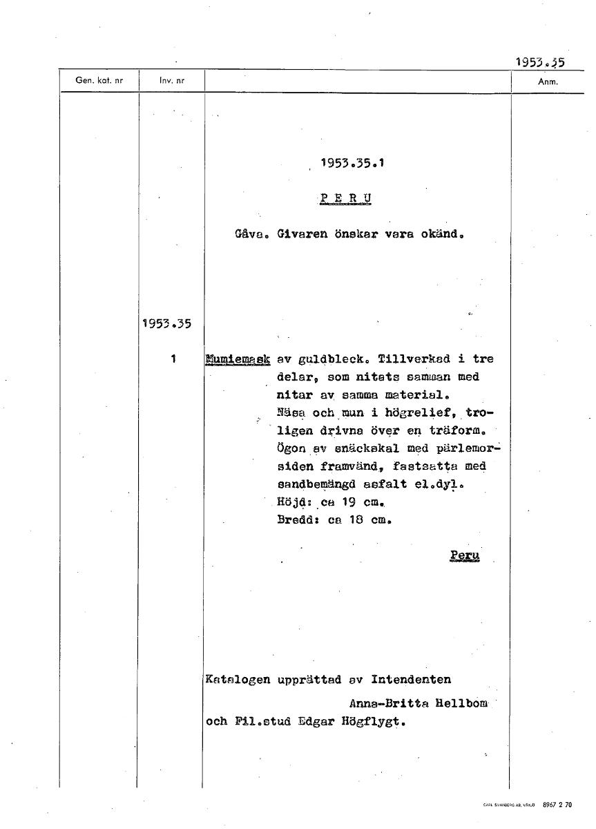 • 195345 1953.35.1 PERU Gåva. Givaren önskar vara okänd. 1953.35 1 Mumiemask av guldbleck. Tillverkad i tre delar, som nitets samman med nitar av samma material. Näsa och mun i högrelief, tro- ligen dri... Visa hela