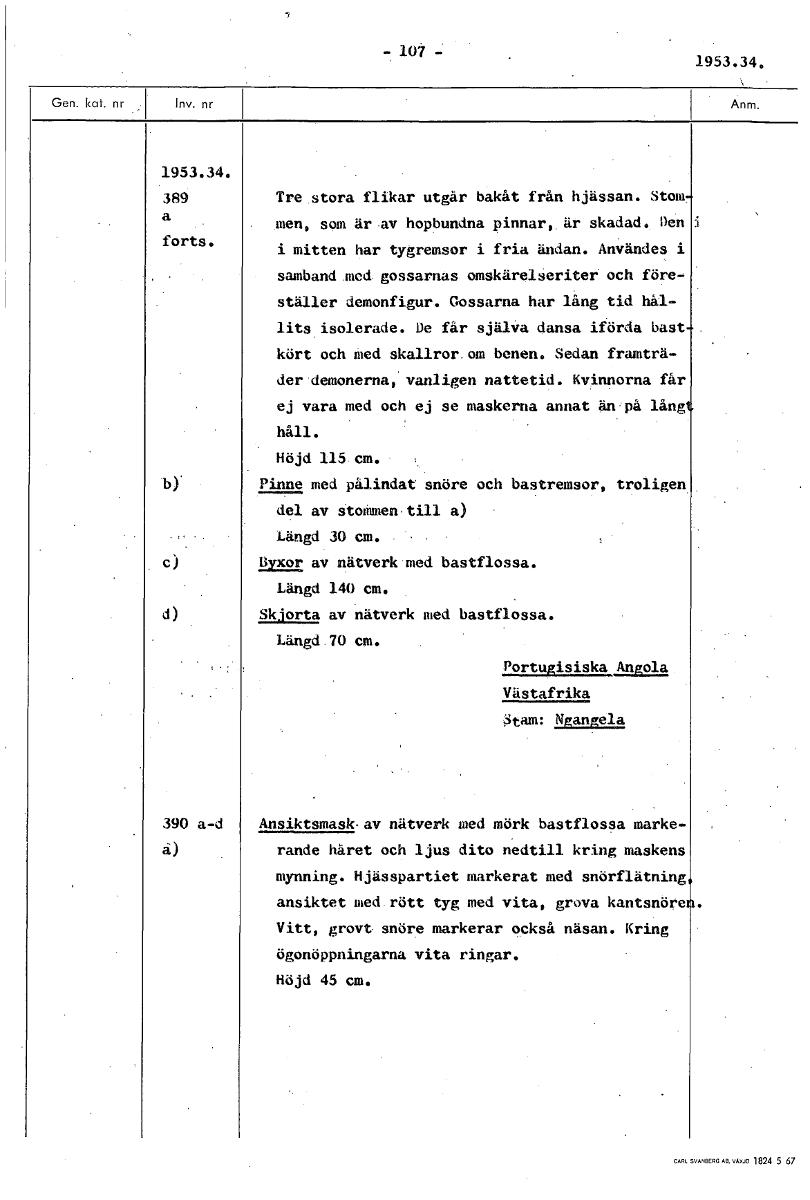 -107- 1953.34, 1953.34. 389 Tre stora flikar utgår bakåt från hjässan. Stom a men, som är av hopbundna pinnar, är skadad. Den forts. i mitten har tygremsor i fria ändan. Användes i samband med gossarnas omskärelseriter och före- ställer demonfigur. Gossarna har lång tid hål- lits isolerade. De får själva dansa iförda bast kört och med skallror om benen. Sedan framträ- der demonerna, vanligen nattetid. Kvinnorna får ej vara med och ej se maskerna annat än på lång håll. Höjd 115 cm. Pinne med pålindat snöre och bastremsor, troligen del av stommen till a) Längd 30 cm. Byxor av nätverk med bastflossa. Längd 140 cm. Skjorta av nätverk med bastflossa. Längd 70 cm. Portugisiska Angola Västafrika stam: Ngangela 390 a-d Ansiktsmask•av nätverk med mörk bastflossa marke- a) rande håret och ljus dito nedtill kring maskens mynning. Hjässpartiet markerat med snörflätning ansiktet med rött tyg med vita, grova kantsnöre Vitt, grovt snöre markerar också näsan. Kring ögonöppningarna vita ringar. Höjd 45 cm. [ocr]