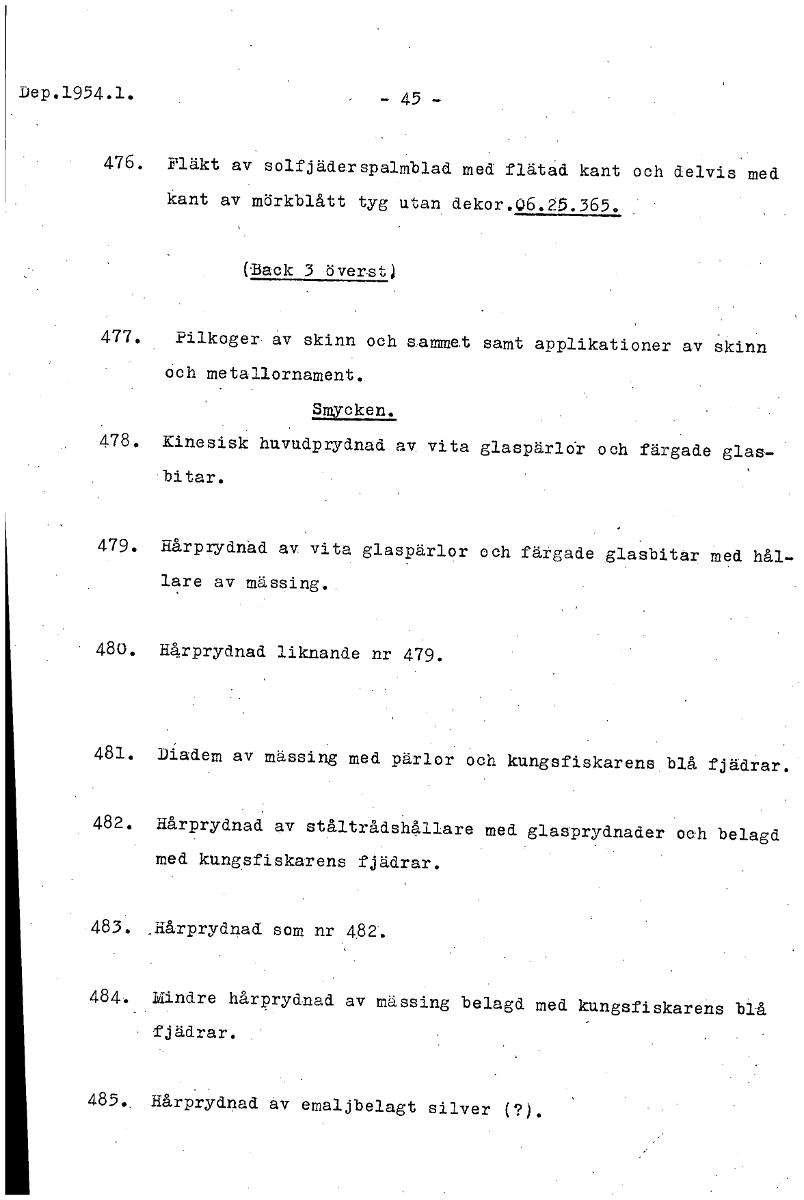 Dep.1954.1. - 45 - 476. Fläkt av solfjäderspalmblad med flätad kant och delvis med kant av mörkblått tyg utan dekor.06.25.365. (2eck 3 överst) 477. Pilkoger av skinn och sammet samt applikationer av skinn och metallornament. Smycken. 478. Kinesisk huvudprydnad av vita glaspärldr och färgade glas- bitar. 479. Hårprydnad av vita glaspärlor och färgade glasbitar med hål- lare av mässing.. 480. H4rprydnad liknande nr 479. 481. Diadem av mässing med pärlor och kungsfiskarens blå fjädrar. 482. Hårprydnad av ståltrådsh4llare med glasprydnader oeh belagd med kungsfiskarens fjädrar. 483. .Hårprydnad som nr 482. 484. blindre hårprydnad av mässing belagd med kungsfiskarens blå • fjädrar. 485. Hårprydnad av emaljbelagt silver (?). [ocr]Stäng