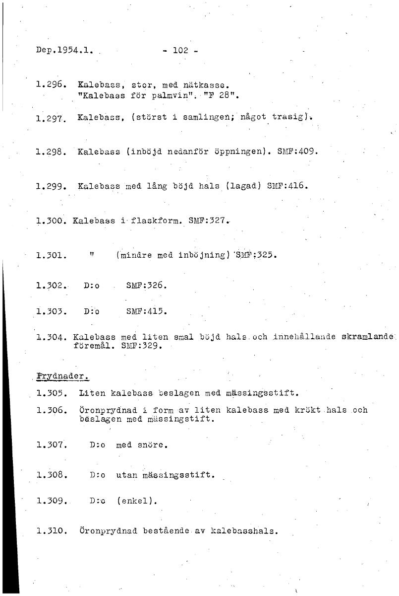 Dep.1954.1. - 102 - 1.296. Kalebass, stor, med nätkasse. "Kalebass för palmvin", "F 28". 1.297. Kalebass, (störst i samlingen; något trasi 1.298. Kalebass (inböjd nedanför öppningen). SMF:409. 1.299. Kalebass med lång böjd hals (lagad) SMF:416. 1.300. Kalebass i flaskform. SMF:327. 1.301. (mindre med inböjningrSiMF:325. 1.302. D:o SMF:326. 1.303. D:o SMF:415. 1.304. Kalebass med liten smal böjd hals och innehållande skramlande föremål. SMF:329. prydnader. 1.305. Liten kalebass beslagen med mässingsstift. 1.306. Öronprydnad i form av liten kalebass med krökt.hals .och beslagen med mössingstift. 1.307. D:o med snöre. 1.308. D:o utan mässingsstift. " 1.309.. D:o (enkel). 1.310. Öronprydnad bestående. av kalebasshals. [ocr]Stäng