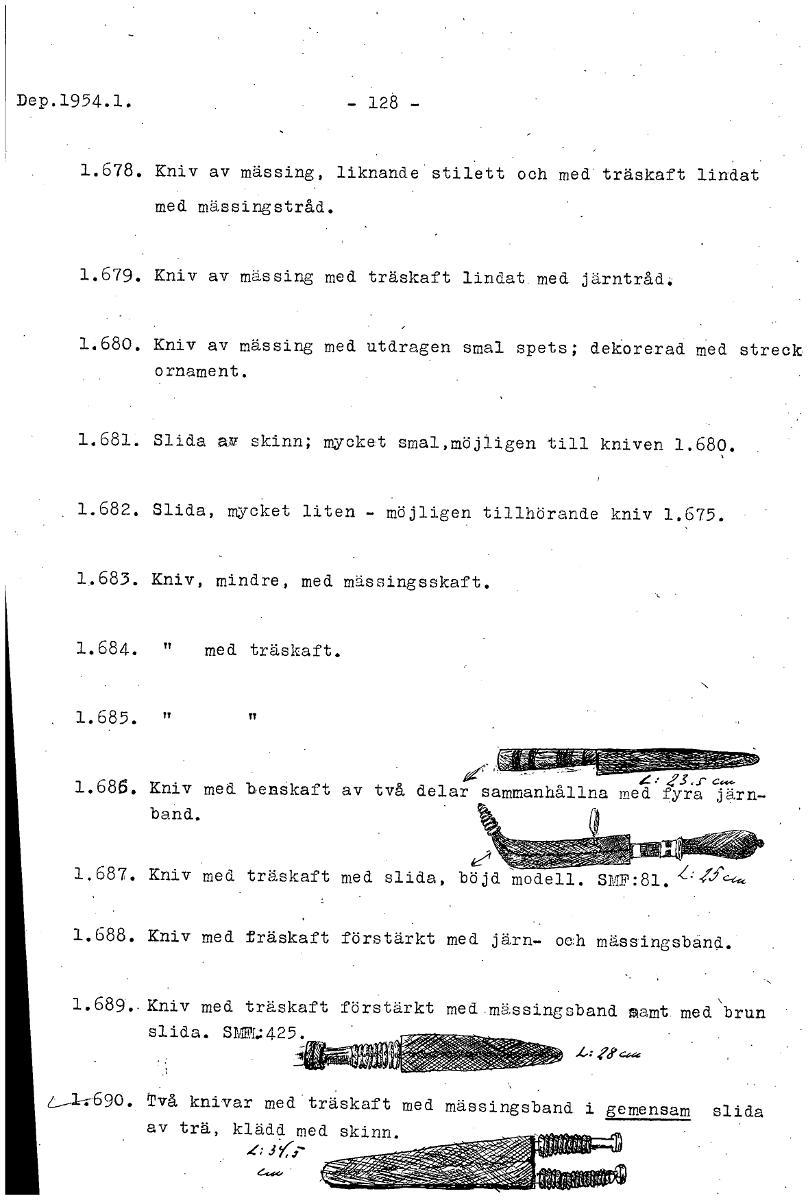 Dep.1954.1. - 128 - 1.678. Kniv av mässing, liknande stilett och med träskaft lindat med mässingstråd. 1.679. Kniv av mässing med träskaft lindat. med järntråd. 1.680. Kniv av mässing med utdragen sma...