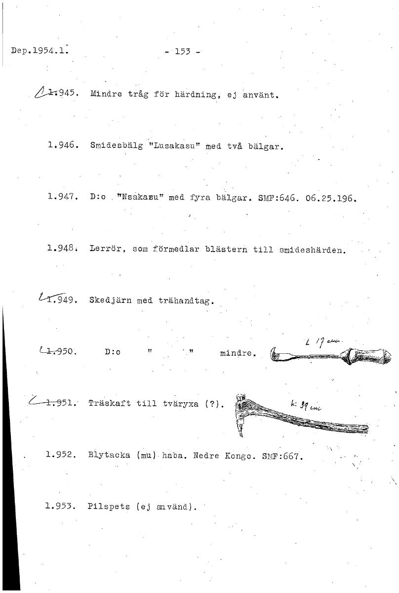 • Dep.1954.1. - 153 4,11945. Mindre tråg för härdning, ej använt. 1.946. Smidesbälg "Lusakasu" med två bälgar. 1.947. D:o "Nsakasu' med fyra bälgar. SMP:646. 06.25.196. 1.948. Lerrör, som förmedlar bläs... Visa hela