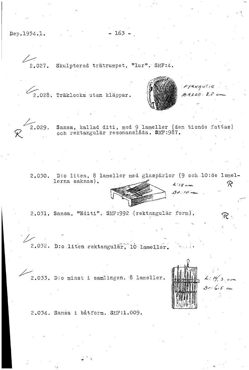 Dep.1954.1. - 163 - 2.027. Skulpterad trätrumpet, "lur". SMF:4. 2.028. Träklocka utan kläppar. /Z a 1, G/ - 2.029. Sansa, kallad diti, med 9 lameller (den tionde fattas Och rektangulär resonanslåda. SMF:987. 2.030. D:o liten, 8 lameller med glaspärlor (9 och 10:de lerna saknas). 2.031. Sansa, "Nditi". SMF:992 .(rektangulär form 2,032. b:o liten rektanguläi-,'16 /2.033. D:o minst i samlingen. 8 lameller. C 2.034. Sansa i båtform. SMF:1.009. [ocr]