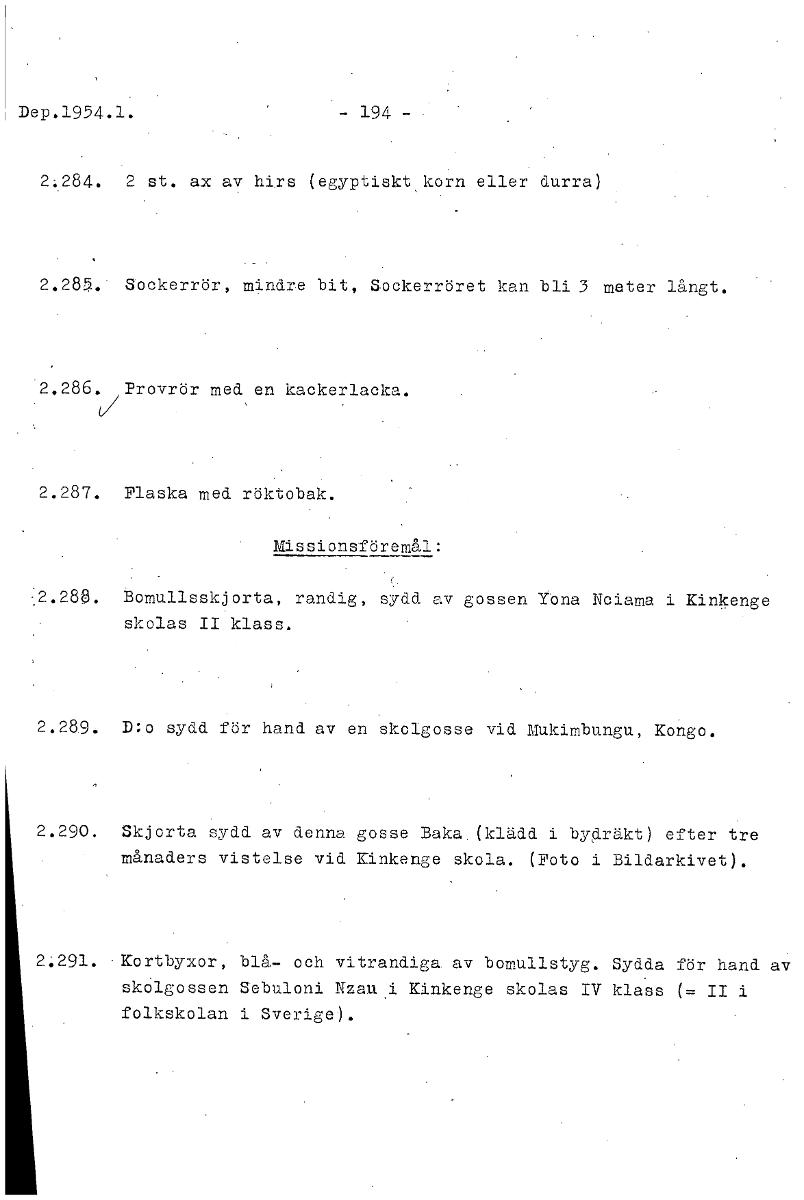 Dep.1954.1. - 194 - 2.284. 2 st. ax av hirs (egyptiskt korn eller durra) 2.28.- Sockerrör, mindre bit, Sockerröret kan bli 3 meter långt. 2.286. Provrör med en kackerlacka. 2.287. Flaska med röktobak. Missionsföremål: 2.288. Bomullsskjorta, randig, sydd av gossen 'fana Nciama i Kinkenge skolas II klass. 2.289. D:o sydd för hand av en skolgosse vid Mukimbungu, Kongo. 2.290. Skjorta sydd av denna gosse Baka.(klädd i bydräkt) efter tre månaders vistelse vid Kinkenge skola. (Foto i Bildarkivet). 2.291. -Kortbyxor, blå- och vitrandiga. av bomullstyg. Sydda för hand av skOlgossen Sebuloni PTaau i Kinkenge skolas IV klass (= II i folkskolan i Sverige). [ocr]Stäng