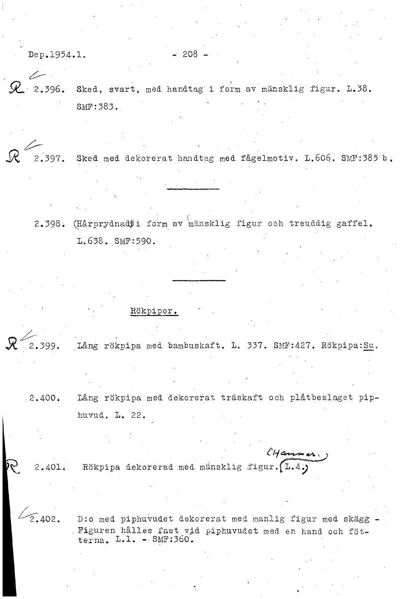 Dep.1954.1. - 208 - 2.. 2.396. Sked, svart, med handtag i form av mänsklig figur. L.38. SMF:383. .3./C 2.397. Sked med dekorerat handtag med fågelmotiv. L.606. SMF:385 b; Qiårprydna0i form av mänsklig figur och treuddig gaffel; 1.638. SMF:590. Rökpipor. 2.399. Lång rökpipa med bambuskaft. 1. 337. SMF:427. Rökpipa:Su. .2.400: Lång rökpipa med dekorerat träskaft och plåtbeslaget pip- huvud. L. 22. 2.401: Rökpipa dekorerad med mänsklig figur. L.4«..) D:o med piphuvudet dekorerat med manlig figur med skägg - ,Figuren hålles fast vid piphuvudet med en hand och föt- terna. 1,.1. -.SMF:360. [ocr]Stäng