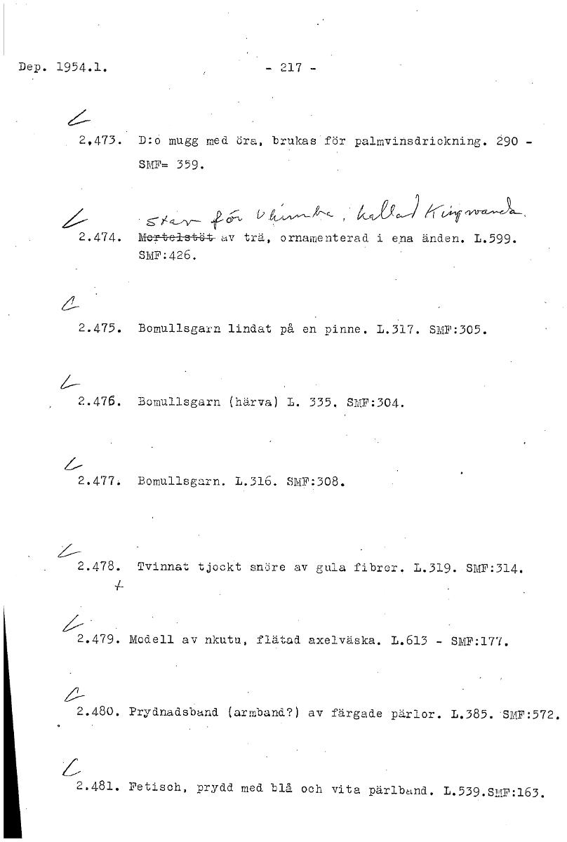 Dep. 1954.1. - 217 - 2,473. D:o mugg med öra, brukas för palmvirisdrickning. 290 - SMF= 359. 2 u 2.474. 147etea-st-ie,4 av trä, ornarnenterad i ena änden. L.599. SIvIF:426. 2.475. Bomullsgarn lindat på en pinne. L.317. SMF:305. 2.476. Bomullsgarn (härva) L. 335, SMF:304. 2.477, Bomullsgarn. L.316. SMF:308. 2.478. Tvinnat tjockt snöre av gula fibrer. 1.319. SMF:314. 2.479. Modell av nkutu, flätad axelväska. 1.613 - SMF:I77. 2.480. Prydnadsband (armband?) av färgade pärlor. L.385. SMF:572. L 2.481. Fetisch, prydd med blå och vita pärlband. L.539.SmF:163. [ocr]