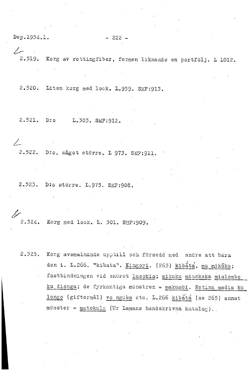 Dep.1954.1. - 222 - Lr 2.519. Korg av rottingfiber, formen liknande en portfölj. L 1012. 2.520. Liten korg med lock. L.959. SMF:913. 2.521. D:o L.303. SMF:912. L 2.522. D:o, något större. L 973. SMF:9...Visa hela