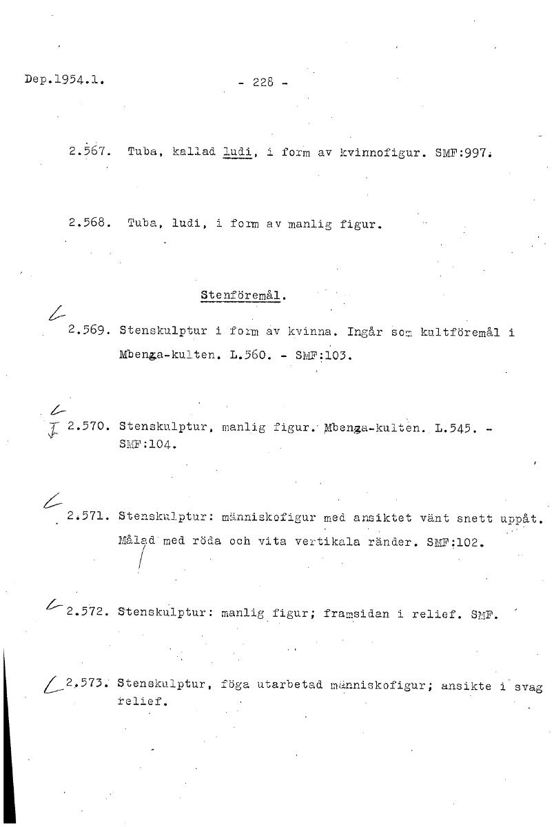 Dep.1954.1. - 228 - 2.567. Tuba, kallad ludi, i forM av kvinnofigur. SMF:997. 2.568. Tuba, ludi, i form av manlig figur. Stenföremål. 2.569. Stenskulptur i form av kvinna. Ingår som kultföremål i Mben...