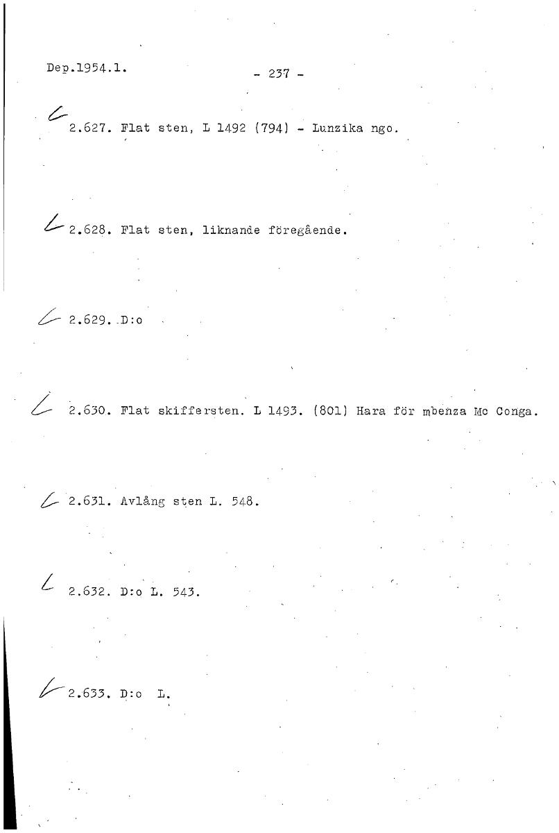• Dep.1954.1. - 237- 2.627. Flat sten, L 1492 (794) - Lunzika ngo. g(--2.628. Flat sten, liknande föregående. 2.629.,D:o 2.630.. Flat skiffersten. L 1493. (801) Hara för mbenza Mc Conga. 1_ 2.631. Avlån... Visa hela