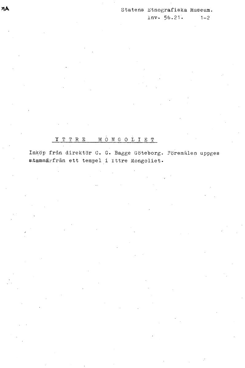 • Statens Etnografiska Museum. 'ny-. 56.21. 1-2 YTTRE MÖNGOLIET Inköp frän direktör C. G. Bagge Göteborg. Föremålen uppges stammärfrån ett tempel i Yttre Mongoliet. [ocr]