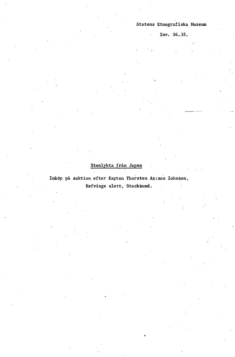 • Statens Etnografiska Museum Inv. 56.35. Stenlykta från Japan Inköp på auktion efter Kapten Thorsten Ax:son Iohnson, Kefvinge slott, Stocksund. [ocr]