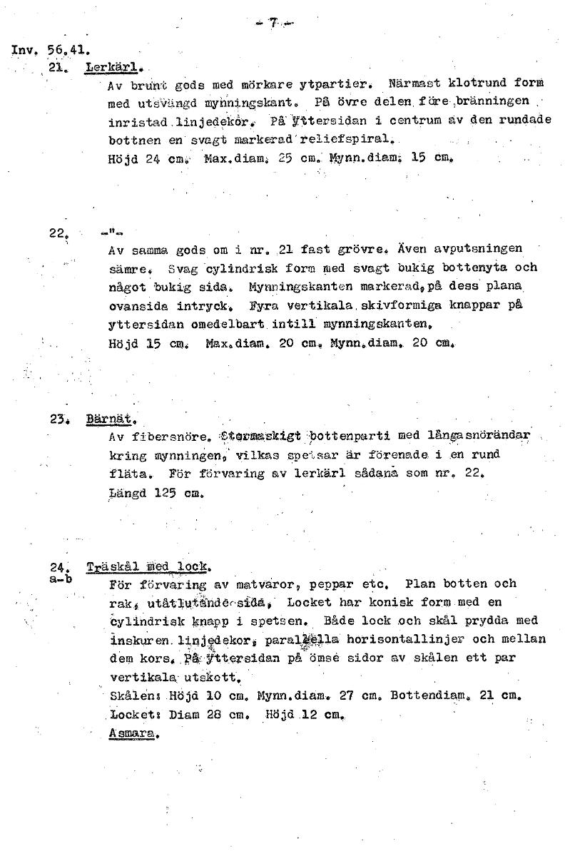 7.-- Inv. 56.41. 21, Lerkrl. Av brunt gods med mörkare ytpartier. Närmast klotrund form med utsVängd myhningskant. pa övre delen, före ,bränningen inristad.linjedekår: På' Yttersidan i centrum av den ...