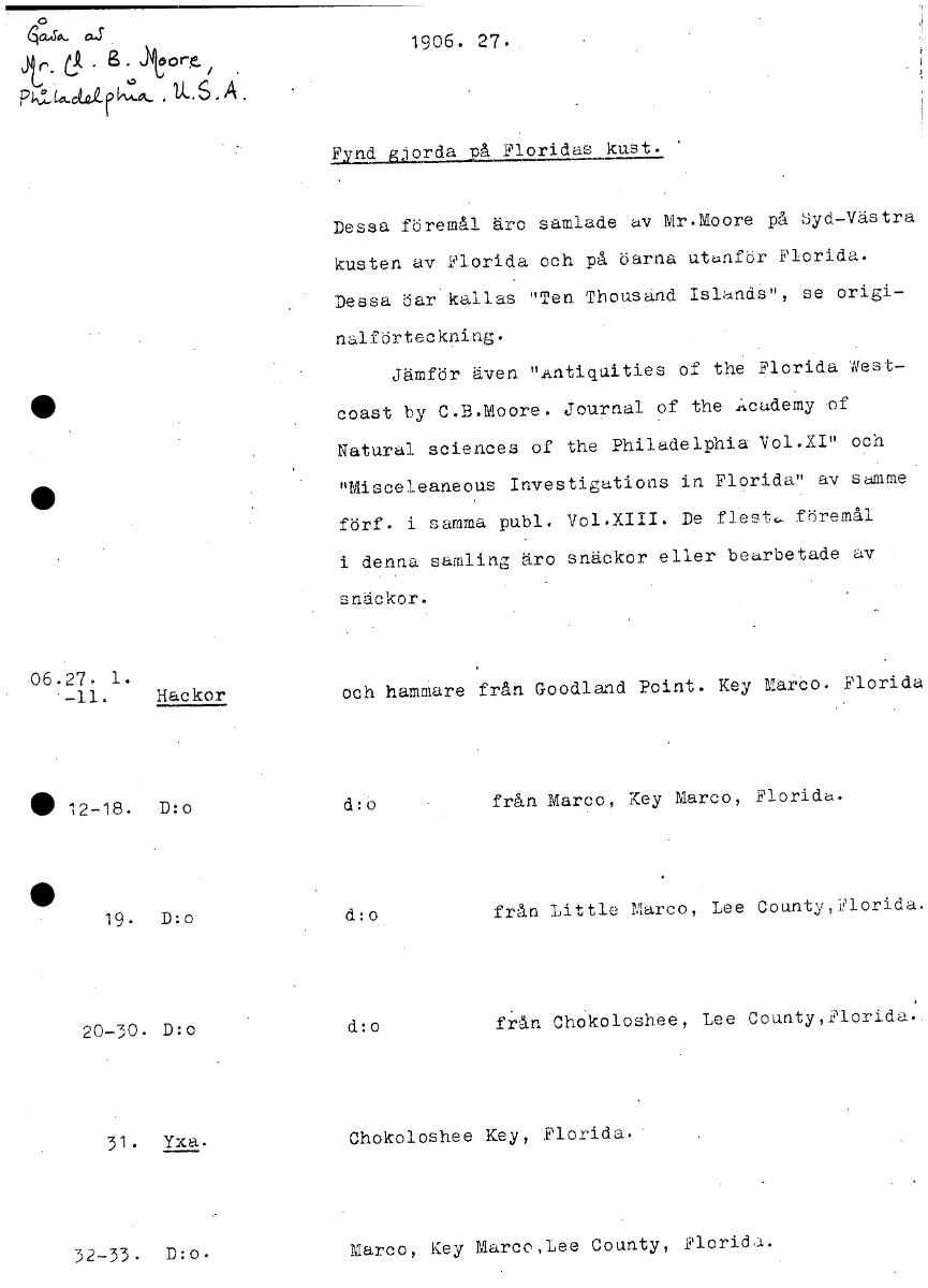 1906. 27. t g . oor,c A 231A9LE1=1-st2iLLII:11hlkust. Dessa föremål äro samlade av Mr.Moore på Syd-Västra kusten av Florida och på öarna utanför Florida. Dessa öar kallas "Ten Thousand Islands", se or...