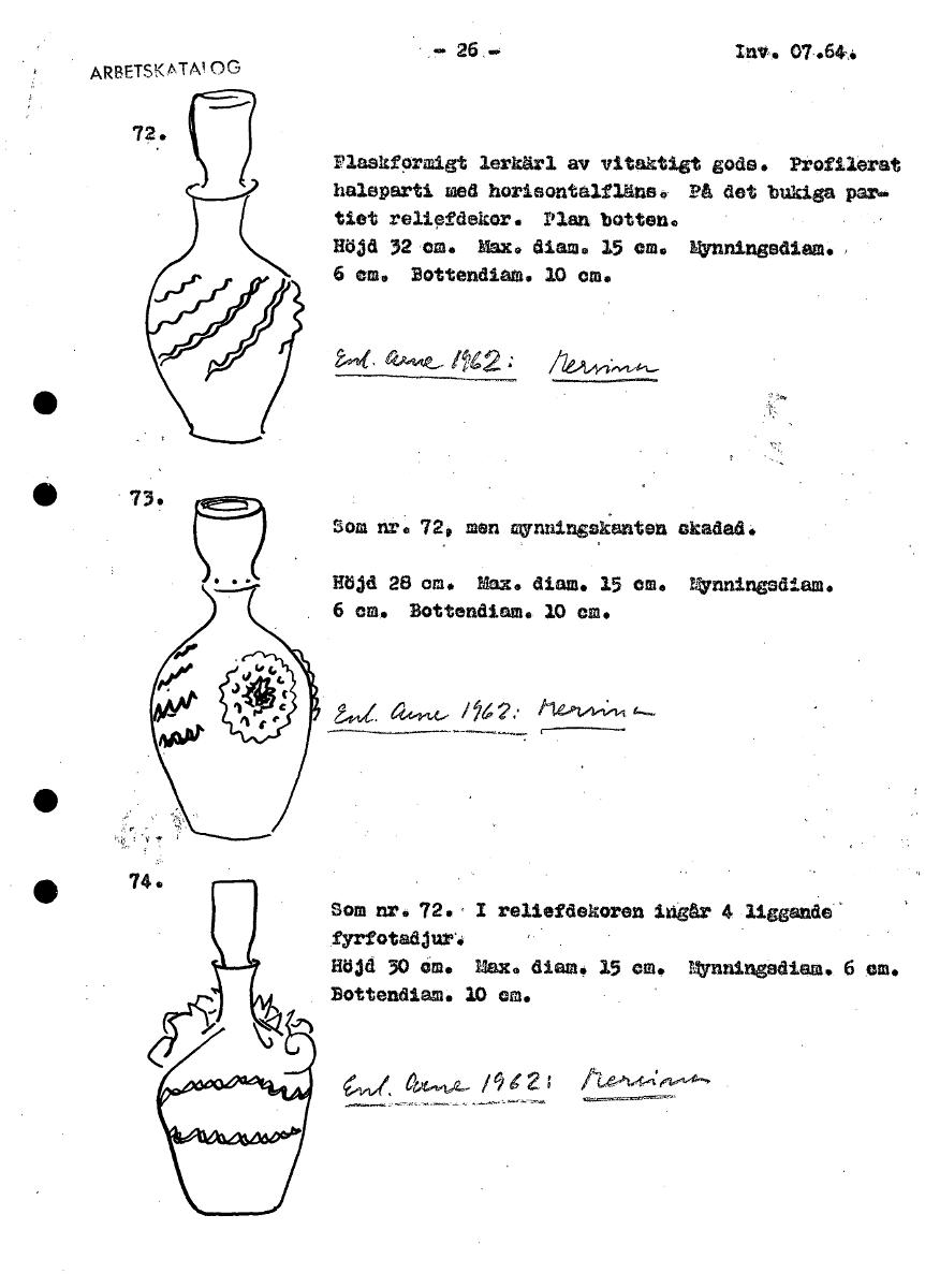.-- 26 . Inv. 07.64.. ARBETSK ATM OG 72. Plaskformigt lerkärl av vitaktigt gode. Profilerat haleparti med horisontalfläne. P& det buki par- tiet reliefdekor. Plan botten. Höjd 32 cm. Max. diam. 15 cm. MYnningediame 6 cm. Bottendiam. 10 cm. cump,_, ; beA, • • 73. Som nr. 72p men mynningskanten okadad. Höjd 28 om. Max. diam. 15 cm. Mynningediam. 6 cm. Bottendiam, 10 cm. • 74. • Som inri 72. I reliefdekoren ingär 4 'leande' fyrfotadjur. Höjd 30 cm. Max. diam 15 cm. Mynningediam. 6 cm. Bottendiam. 10 cm. 0~- g 2 ; i [ocr]Stäng