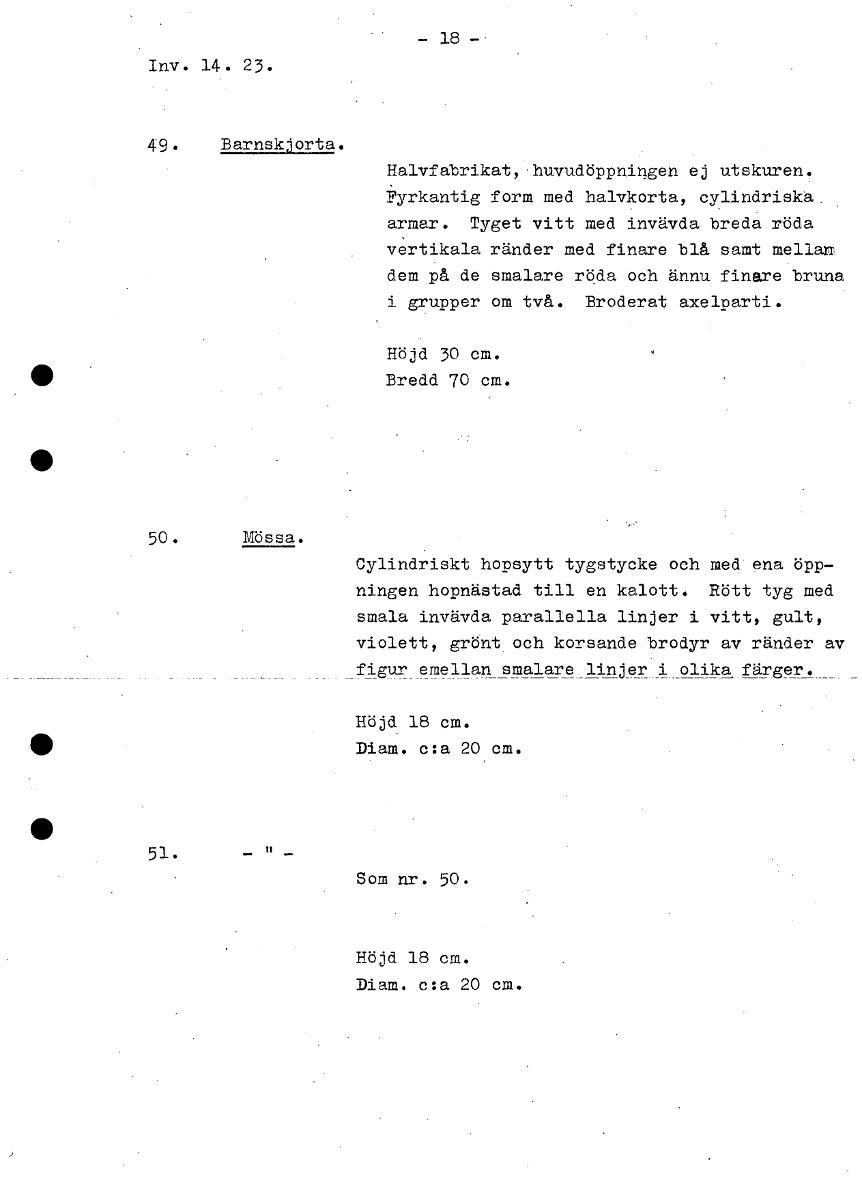 - 18 Inv. 14. 23. 49. Barnskjorta. Halvfabrikat, huvudöppningen ej utskuren. Fyrkantig form med halvkorta, cylindriska armar. Tyget vitt med invävda breda röda vertikala ränder med finare blå samt mellan dem på de smalare röda och ännu finare bruna i grupper om två. Broderat axelparti. Höjd 30 cm. Bredd 70 cm. 50. Mössa. Cylindriskt hopsytt tygstycke och med ena öpp- ningen hopnästad till en kalott. Rött tyg med smala invävda parallella linjer i vitt, gult, violett, grönt och korsande brodyr av ränder av figur emellan smalare linjer i olika färger. Höjd 18 cm. Diam. c:a 20 cm. • 51. Som nr. 50. Höjd 18 cm. Diam. c:a 20 cm. [ocr]Stäng