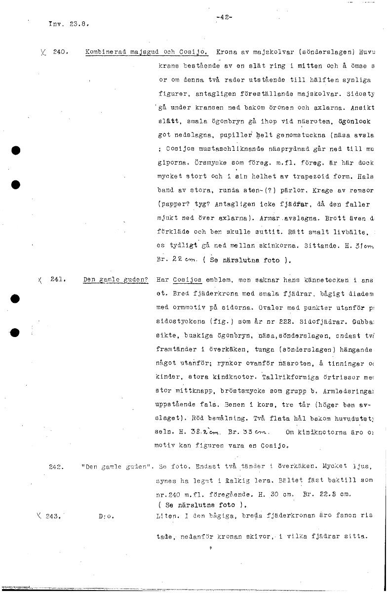 -42- Inv. 23.8. X_ 240. Kombinerad majsgud och Cosijo. Krona av majskolvar (sönderslagen) Huvu krans bestående av en slät ring i mitten och å ömse s or om denna två rader utstående till hälften synliga figurer, antagligen föreställande majskolvar. Sidosty 'gå under kransen ned bakom öronen och axlarna. Ansikt slått, smala ögonbryn gå ihop vid näsroten, Ngonloek got nedslagna, pupille12 hit genomstuckna (näsa avsla • ; Cosijos mustaschliknande näsprydnad går ned till mu giporna. örsmycke som föreg. m.fl. föreg. är här dock mycket stort och i stn helhet av trapezoid form. Hals • band av stora, runda sten-(?) pärlor. Krage av remsor (papper? tyg? Antagligen icke fjädfar, då den faller mjukt ned över axlarna). Armar avslagna. Brott även d förkläde och ben skulle suttit. Rätt smalt livbälte, es tydligt gå ned mellan skinkorna. Sittande. H. 31Cirn Br. 22, ( Se närslutna foto ). K 241. Den 0-amle ,Y.uden? Har.Cosijos, emblem, men saknar hans kännetecken i ans et. Bred fjåderkrona med smala fjädrar, bågigt diadem • med ormmotiv på sidorna. Ovaler med punkter utanför sidostyokena (fig.) som år nr 222. Sidofjädrar. Gubbw 110 sikte, buskiga ögonbryn, näsa,sönderslagen, endast tvi framtänder i överkäken, tunga (sönderslagen) hängande något utanför; rynkor ovanför näsroten, å tinningar 0( kinder, stora kindknotor. Tallrikformiga örtrissor me( stor mittknapp, bröstsmycke som grupp Armledsringal uppstående falå- Benen i kors, tre tår (höger ben av- slaget).• Röd bemålning. Två flata hål bakom huvudutst seln. H. Br. 33 c-r6.. Om kindknotorna äro cp motiv kan figuren vara en Cosijo. 242. "Den gamIle guien". 3e foto. Endast två ,ånier i överkåKen. Mycket ',lus, synes ha leg'It i lalklg lera. Hltet fäst baktill som nr.240 m.fl. före&Lende. H. 30 cm. Br. 22.8 cm. ( Se närslutna foto ). K 243. Liten. I den bAgiga, breg.a fjäderkronan äro fanen ris tade,. nedanför kronan skivor,• i vilka fjädrar sitta. [ocr]