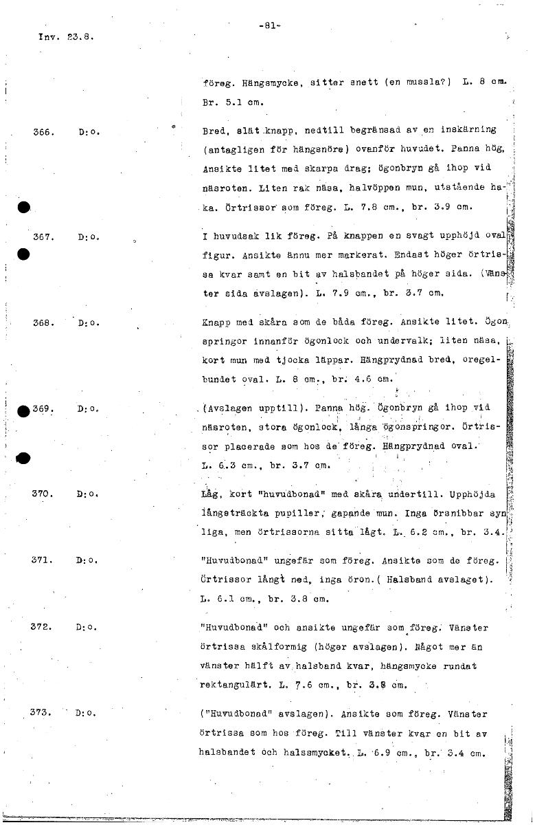 -81- Inv. 23.8. föreg. Hängsmycke, sitter snett (en mussla?) L. 8 cm. Br. 5.1 em. 366. D:o. Bred, slät knapp, nedtill begränsad av en inskärning (antagligen för hängsnöre) ovanför huvudet. Panna hög, ...