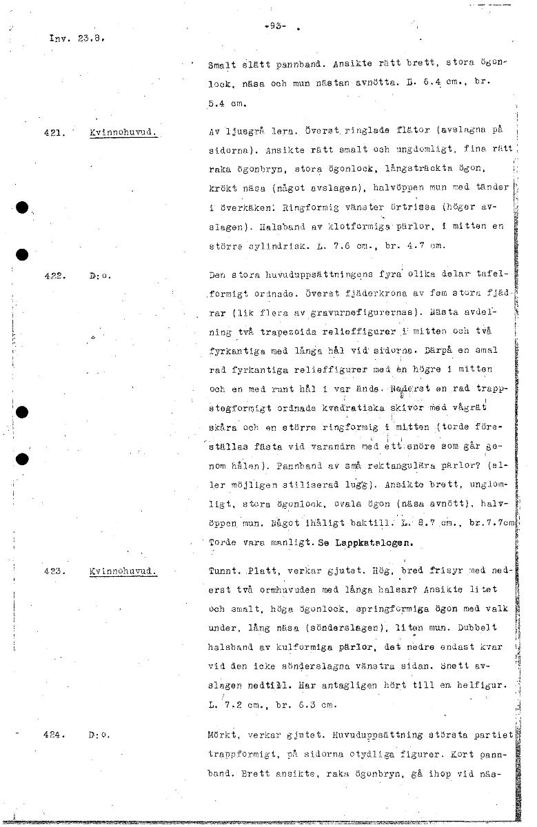 -93- inv. 23.8. Smalt Slätt pannband. Ansikte rätt brett, stora ögon- lock, näsa och mun nästan.avnötta. 6.4 cm., br. .5.4 cm. 421. • Kvinnohuvud. Av ljusgrå lera. Överst ringlade flätor (avslagna på ...