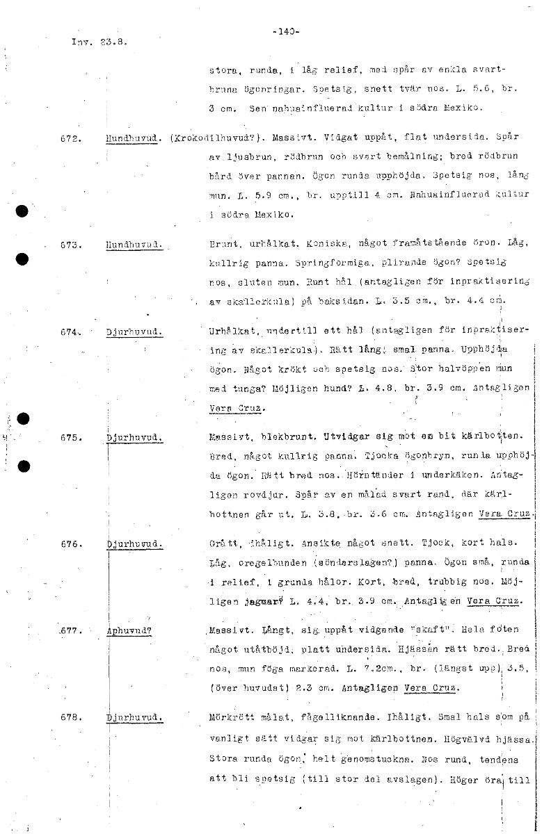 -140- Inv. 23.8. stora, runda, i låg relief, med spår av enkla svart- bruna ögonringar. Spetsig, snett tvär nos. L. 5.6, br. 3 cm. Sen. nabuainfluerad kultur i södra Mexiko. Hundhuvud. (Krokodilhuvud?...