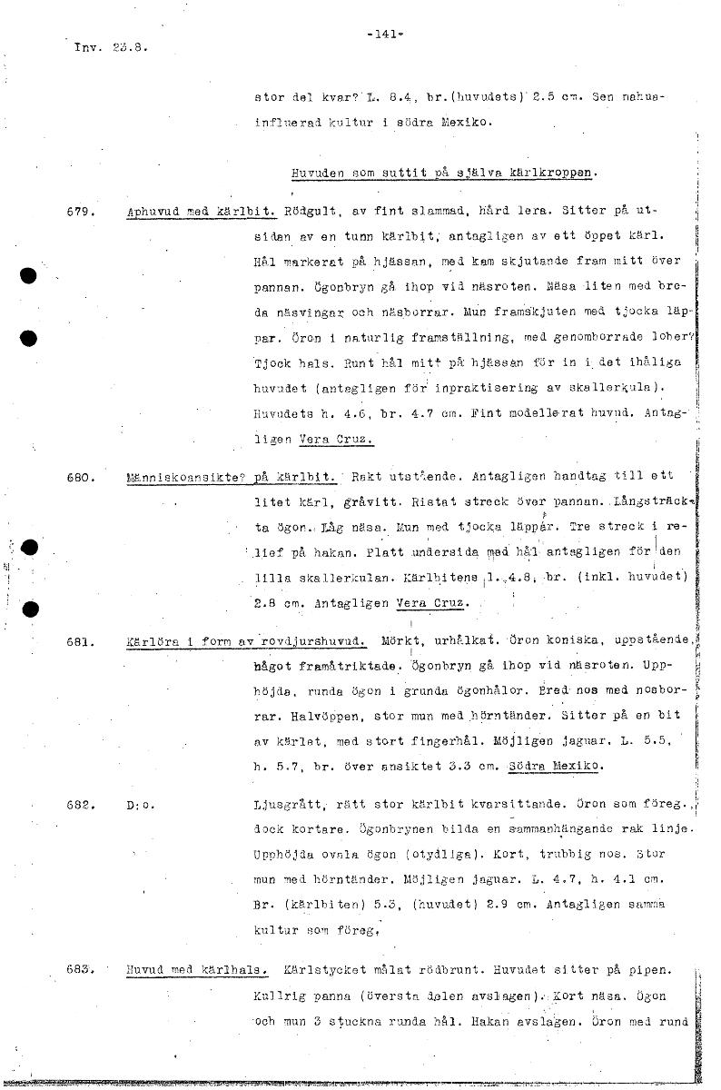 -141- Tnv. 23.8. stor del kvar? L. 8.4, br.(huvudets)'2.5 em. Sen nahua- influerad kultur i södra Mexiko. Huvuden som suttit på själva kärlkroppen. 679. Aphuvud med kärlbit. Rödgult, av fint slammad, ...