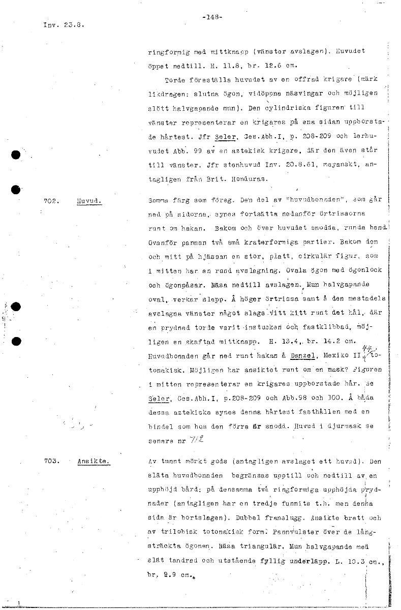 -148- Inv. 23.8. ringformig med mittknapp (vänster avslagen). Huvudet öppet nedtill. H. 11.8, br. 12.6 cm. Torde föreställa huvudet av en offrad krigarelmärk likdragen: slutna ögon,' vidöppna näsvinga...