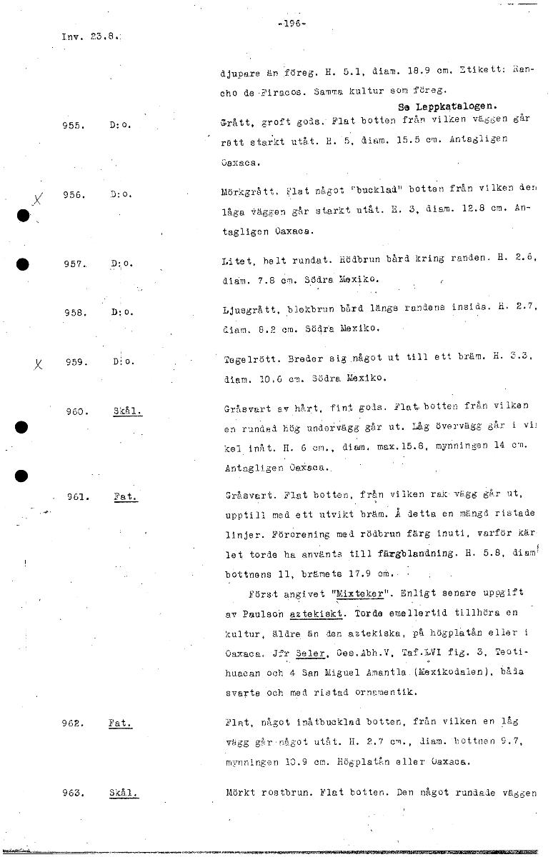 -196- Inv. 23.8. djupare än föreg. H. 5.1, diam. 18.9 cm, Etikett: Ran- ch() de.Firacos. Samma kultur som föreg. Se Leppkatalogen. 955. D: Grått, groft gods. Flat botten från vilken vaggen gär rätt star:kt utåt. H. '5, diam. 15.5 cm. Antagligen Gaxaca. 956. D:o. Mörkgrått. Flat något "bucklad" botten från vilken den låga Väggen går starkt utåt. H. 3, diam. 12.8 cm. An- tagligen Oaxaca- 957.. J:y). Litet, helt rundat. Rödbrun bård kring randen. H. 2.6, diam. 7.8 Cm. Södra Mexiko. 958. D:o. Ljusgrått, blekbrun bård längs randens insida. ä. 2.7, diam. 8.2 cm. Södra Mexiko. 959. D:o. Tegelrött. Breder sig något ut till ett bräm. E. 3.3, diam. 10.6 cm. Södra Mexiko. 960. Skål. Gråsvart av hårt, fint gols. Flat, botten från vilken en rundad hög undervägg går ut. Låg övervägg går i vi' kel inPit. H. 6 cm., diam. max.15.8, mynnint,Len 14 cm. Antagligen 0a3.ceea.. - 961. Fat.' Gråsvart. Flat botten, från vilken rak vägg går ut, upptill med ett utvikt bräm. Å letta en mängd ristade linjer. Förorening med rödbrun färg inuti, varför Kär let torde ha använts till färgblandning. H. 5.8, diam6 bottnens 11, brämets 17.9 cm. Först -ngivet "Mixteker". Enligt senare uppgift av Paulson aztekiskt. Torde emellertid tillhöra en kultur, äldre än den aztekiska, på högplatån eller i Gaxaca. Jfr Seler, Ges.Abh.V, Taf.L,VI fig. 3, Teoti- huacan och 4 San Miguel Amantla.(Mexikodalen), båda svarta och med ristad ornamentik. 962. Fat. Flat, något inåtbucklad botten, från vilken en låg vägg g?-,r något utåt. H. 2.7 cm., diam. bottnen 9.7, my-rningen 10.9 cm. Högplatån eller Uaxaca. 963. Skål. Mörkt rostbrun. Flat botten. Den något rundade väggen [ocr]