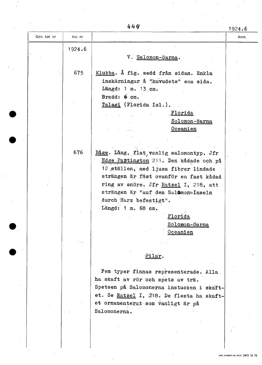 449 1924.6 1924.6 V. Salomon-öarna. 675 Klubba. Å fig. sedd från sidan. Enkla inskärningar å '!huvudets" ena sida. Längd: 1 m. 13 cm. Bredd: 6 cm. Talagi (Florida Isl.). Florida Solomon-öarna Oceanien 676 Båge. Lång,,flativanlig salomontyp..Jfr Edge -Pattington .211. Den kådade och på 12 ställen, med ljusa fibrer lindade strängen är fäst ovanför en fast kådad ring av snöre. Jfr Ratzel I, 218 att strängen är "aufften SalOmo*Inseln dUrch:Rarz befeStigt". Längd: 1 m. 68 cm. Florida Sologon-öarna Oceanien Pilar. Fem typer .finnas representerade. Alla. ha skaft av rör'och spets av trä. Spetsen på SalOgonerna instucken i skal-t- et. Se RatzeI I, 218.4 De flesta ha skaft- et ornamenterat-som vanligt är på • Salomonerna. [ocr]Stäng