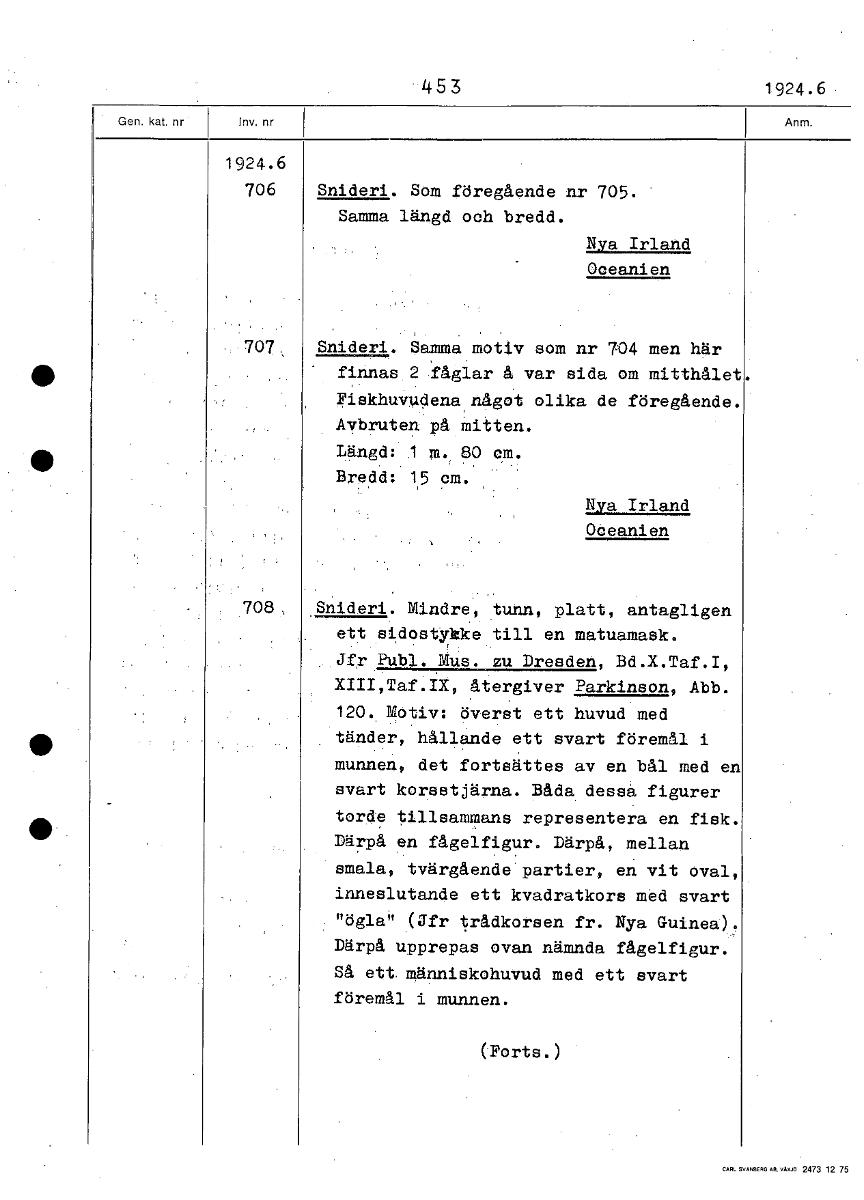 • 453 1924.6 1924.6 706 Snideri. Som föregående nr 705. Samma längd och bredd. Nya Irland Oceanen 707 Snideri. Samma motiv som nr 704 men här finnas 2 'fåglar å var sida om mitthålet Fiskhuvudena något ... Visa hela