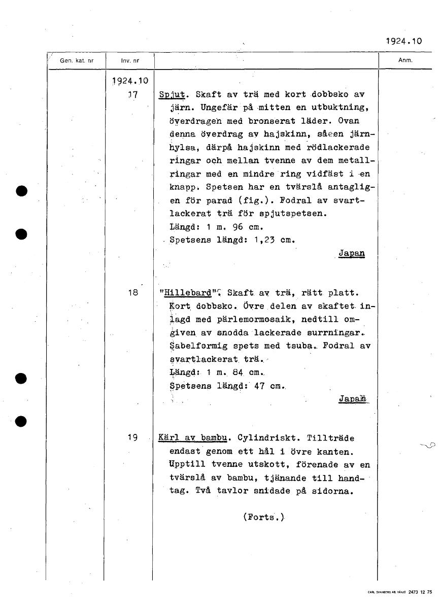 1924.10 1924.10 17 Spjut. Skaft av trä med kort dobbsko av järn. Ungefär på-mitten en utbuktning, överdragen med bronserat läder. Ovan denna överdrag av hajskinn, såeen järn- hylsa, därpå, hajskinn med Ådlackerade ringar och mellan tvenne av dem metall- ringar med en mindre ring vidfäst i -en knapp. Spetsen har en tvärslå antaglig- en för parad (fig.). Fodral av svart- lackerat trä för spjutspetsen. Längd: 1 m. 96 cm. Spetsens längd: 1,23 cm. Japan 18 "Hillebard"'.' Skaft av trä, rätt. platt. Kort dobbsko. övre delen av skaftet in- lagd med pärlemormosaik, nedtill om- given av snodda lackerade surrningar. Sabelformig spets med tsuba. Fodral av svartlackerat trä. Längd: 1 m. 84 cm. SPetsens längd: 47 cm. Ja p ak 19 Kärl av bambu. Cylindriskt. Tillträde endast genom ett hål i övre kanten. Upptill tvenne utskott, förenade av en tvärslå av bambu, tjänande till hand tag. Två tavlor snidade på sidorna. (Forts.), [ocr]
