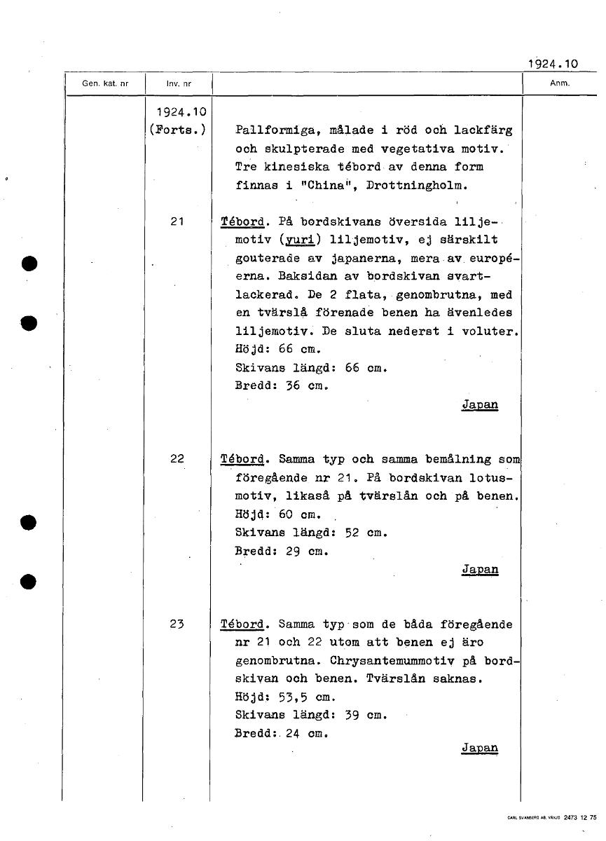 1924.10 1924.10 (Ports.) Pallformiga, målade i röd och lackfärg och skulpterade med vegetativa motiv. Tre kinesiska tebord av denna form finnas i "China", Drottningholm. 21 Tebord. På bordskivans översida lilje- motiv (yuri) liljemotiv, ej särskilt gouterade av japanerna, mera av europé- erna. Baksidan av bordskivan svart- lackerad. De 2 flata, genombrutna, med en tvärslå förenade benen ha ävenledes liljemotiv. De sluta nederst i voluter. Höjd: 66 cm. Skivans längd: 66 cm. Bredd: 36 cm. Japan 22 Mord. Samma typ och samma bemålning som föregående nr 21. På bordskivan lotus- motiv, likaså på tvärslån och på benen. Höjd: 60 cm. Skivans längd: 52 cm. Bredd: 29 cm. Japan 23 Mord. Samma typ som de båda föregående nr 21 och 22 utom att benen ej äro genombrutna. Chrysantemummotiv på bord- skivan och benen. Tvärslån saknas. Höjd: 53,5 cm. Skivans längd: 39 cm. Bredd:. 24 cm. Japan, [ocr]