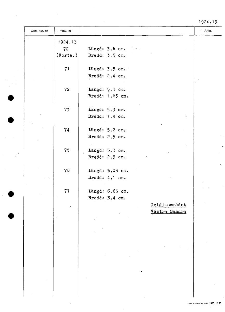 1924.13 1924.13 70 Längd: 3,6 cm. (Forts.) Bredd: 3,5 cm. 71 Längd: 3,5 cm. Bredd: 2,4 cm. 72 Längd: 5,3 cm. Bredd: 1,65 cm. 73 Längd: 5,3 cm. Bredd: 1,4 cm. 74 Längd: 5,2 cm. Bredd: 2,5 cm. 75 Längd: 5,3 cm. Bredd: 2,5 cm. 76 Längd: 5,05 cm. Bredd: 4,1 cm. 77 Längd: 6,65 cm. Bredd: 3,4 cm. Igidi-området Västra Sahara [ocr]