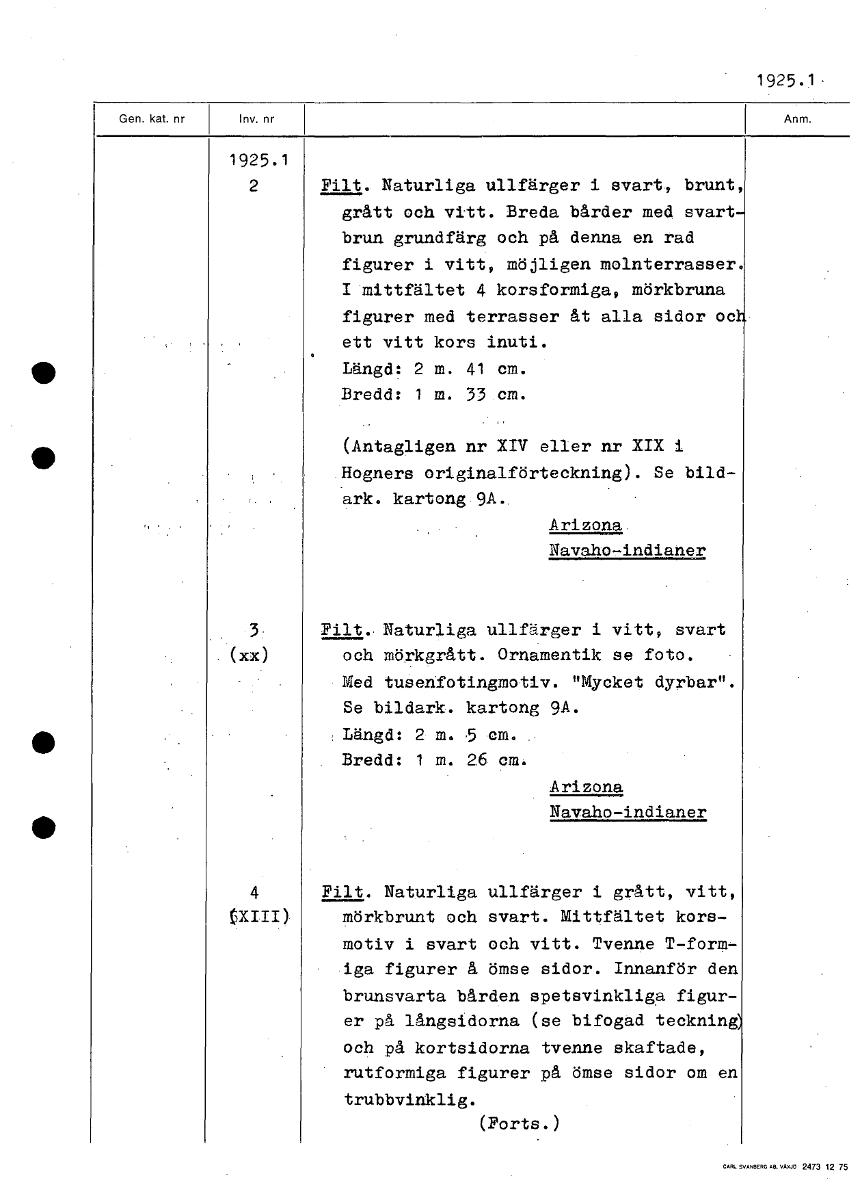 1 925 . 1 1925.1 2 Filt. Naturliga ullfärger i svart, brunt, grått och vitt. Breda bårder med svart- brun grundfärg och på denna en rad figurer i vitt, möjligen molnterrasser. I mittfältet 4 korsformiga, mörkbruna figurer med terrasser åt alla sidor ocl ett vitt kors inuti. Längd: 2 m. 41 cm. Bredd: 1 m. 33 cm. (Antagligen nr XIV eller nr XIX i Hogners originalförteckning). Se bild- ark. kartong 9A. Arizona. Navaho-indianer Filt.• Naturliga ullfärger i vitt, svart och mörkgrått. Ornamentik se foto. Med tusenfotingmotiv. "Mycket dyrbar". Se bildark. kartong 9A. Längd: 2 m. 5 cm. Bredd: 1 m. 2.6 em. Arizona Navaho-indianer 4 Filt. Naturliga ullfärger i grått, vitt, mörkbrunt och svart. Mittfältet kors- motiv i svart och vitt. Tvenne T-form- iga figurer å ömse sidor. Innanför den brunsvärta bården spetsvinkliga figur- er på långsidorna (se bifogäd teckning och på kortsidorna tvenne skaftade, rutformiga figurer på ömse sidor om en trubbvinklig. (Forts.) [ocr]