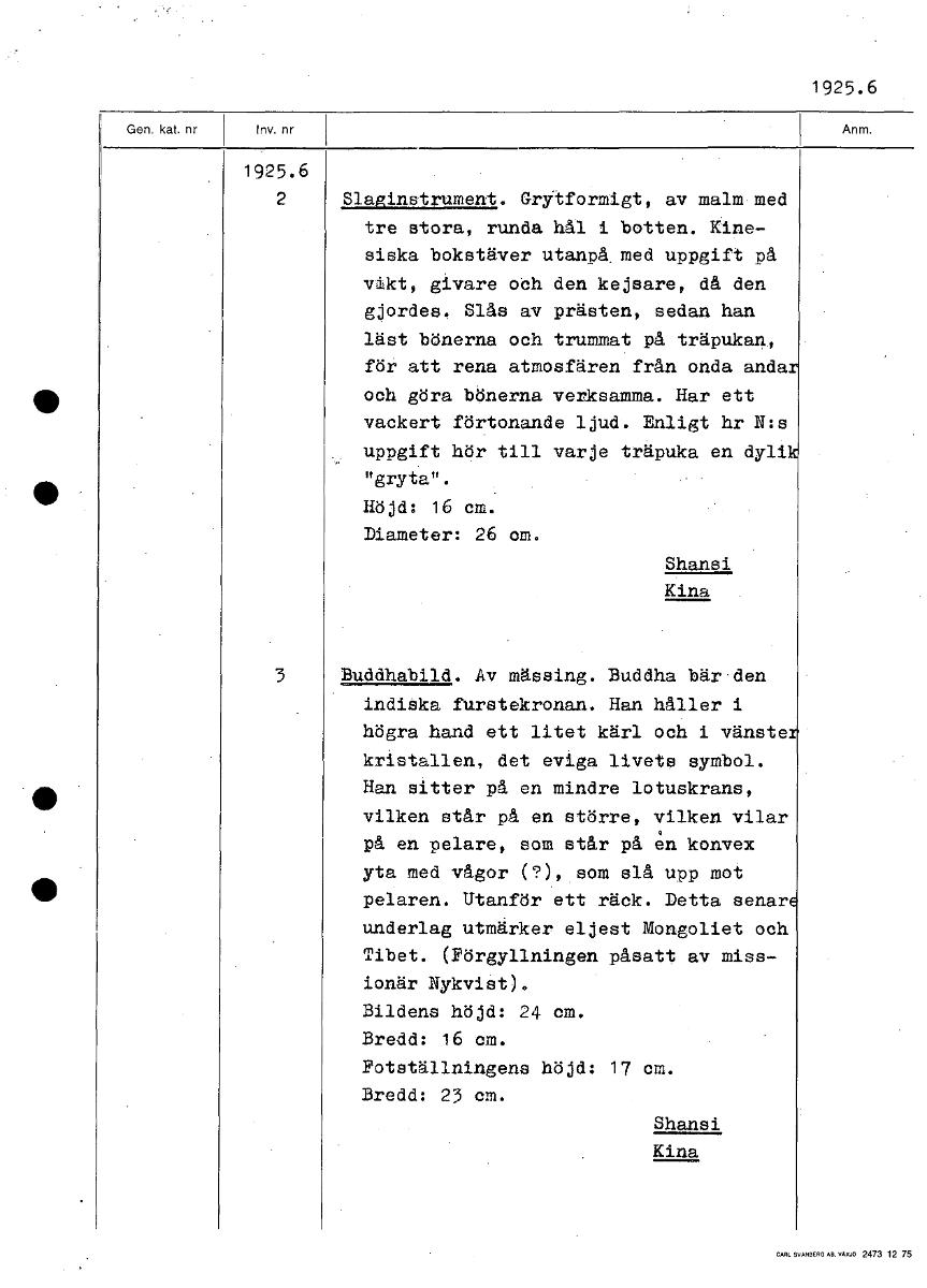 1925.6 1925.6 2 Slaginstrument. Grytformigt, av malm med tre stora, runda hål i botten. Kine- siska bokstäver utanpå med uppgift på vikt, givare och den kejsare, då den gjordes. Slås av prästen, sedan...