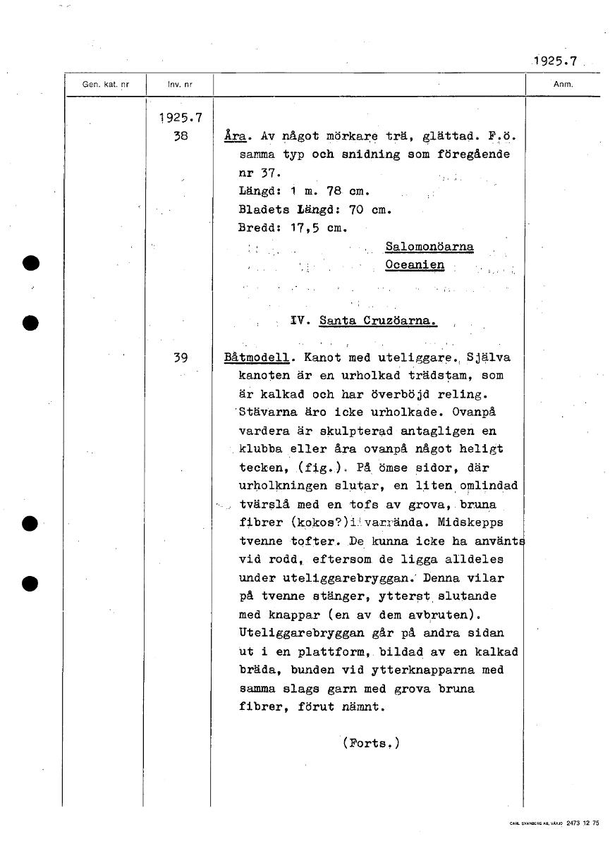 1925.7 1925.7 38 Åra. Av något mörkare trä, glättad. F.ö. samma typ och snidning som föregående nr 37. Längd: 1 m. 78 em. Bladets längd: 70 cm. Bredd: 17,5 cm. Salomonöarna Oceanien IV. Santa Cruzöarna 39 Båtmodell. Kanot med uteliggare. Själva kanoten är en urholkad trädstam, som är kalkad och har överböjd reling. 'Stävarna äro icke urholkade. Ovanpå vardera är skulpterad antagligen en klubba eller åra ovanpå något heligt tecken, (fig.). På ömse sidor, där urholkningen slutar, en liten omlindad tvärslå med en tofs av grova, bruna fibrer (kokos?)i var ända. Midskepps tvenne tofter. De kunna icke ha använt vid rodd, eftersom, de ligga alldeles under uteliggarebryggan.' Denna vilar på tvenne stänger, ytterst, slutande med knappar (en av dem avbruten). Uteliggarebryggan går på andra sidan Ut i en plattform, bildad av en kalkad bräda, bunden vid ytterknapparna med samma slags garn med grova bruna fibrer förut nämnt. (Forts.) [ocr]