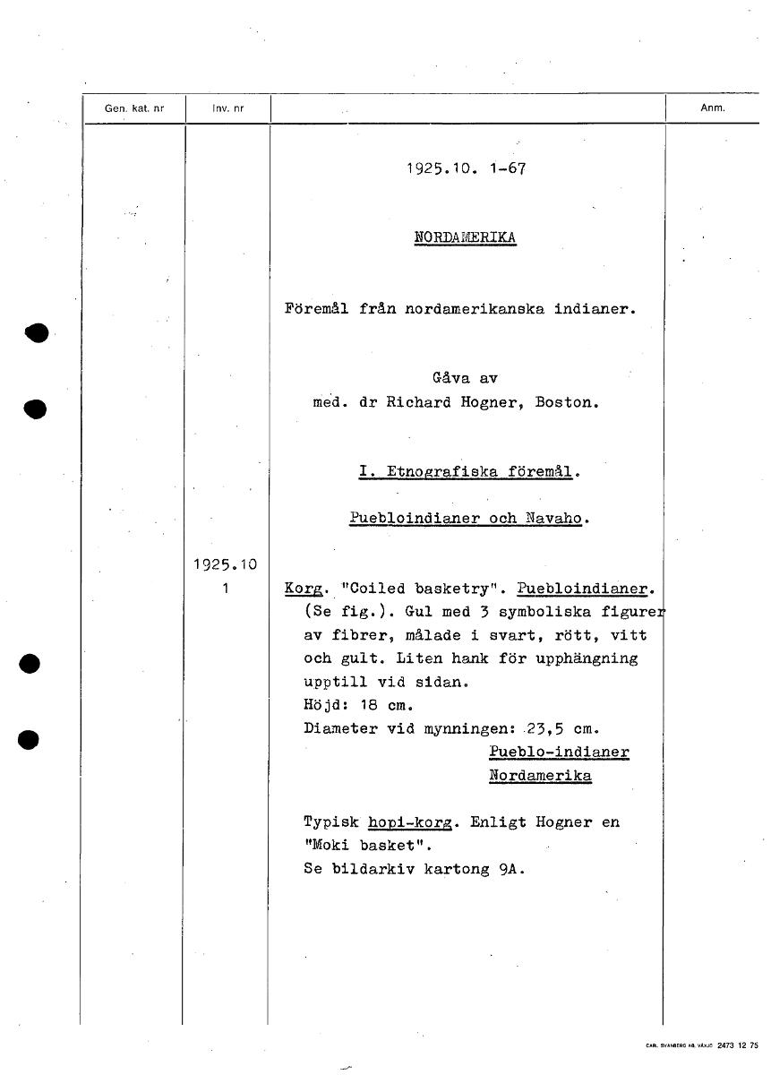 1925.10. 1-67 NORDAMERIKA Föremål från nordamerikanska indianer. Gåva av med. dr Richard Hogner, Boston. I. Etnografiska föremål. Puebloindianer och Navaho. 1925.10 1 Korg. "Coiled basketry". Puebloindianer. (Se fig.). Gul med 3 symboliska figure av fibrer, målade i svart, rött, vitt och gult. Liten hank för upphängning upptill vid sidan. Höjd: 18 cm. Diameter vid mynningen: 23,5 cm. Pueblo-indianer Nordamerika Typisk hopi-korg. Enligt Hogner en "Moki basket". Se bildarkiv kartong 9A. [ocr]Stäng